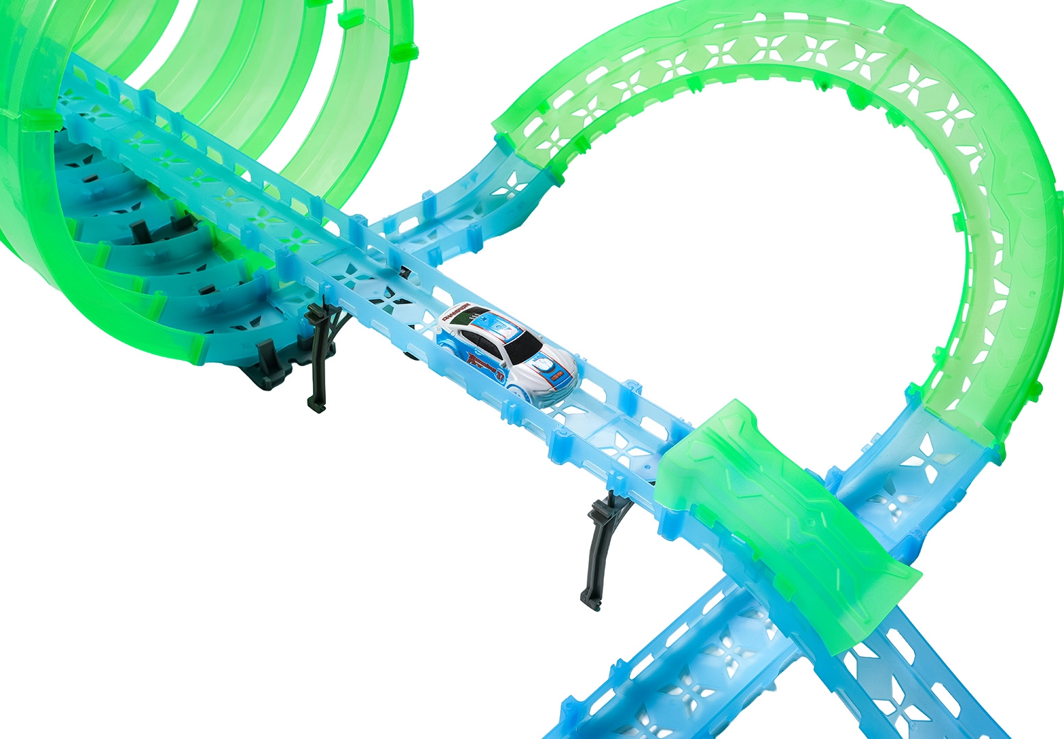 Er zijn twee handbedieningen inbegrepen voor vlotte races met twee spelers. De baan bevat meerdere 360°-loops, verhoogde secties en tunneldelen voor dynamische ritten en stuntafritten.