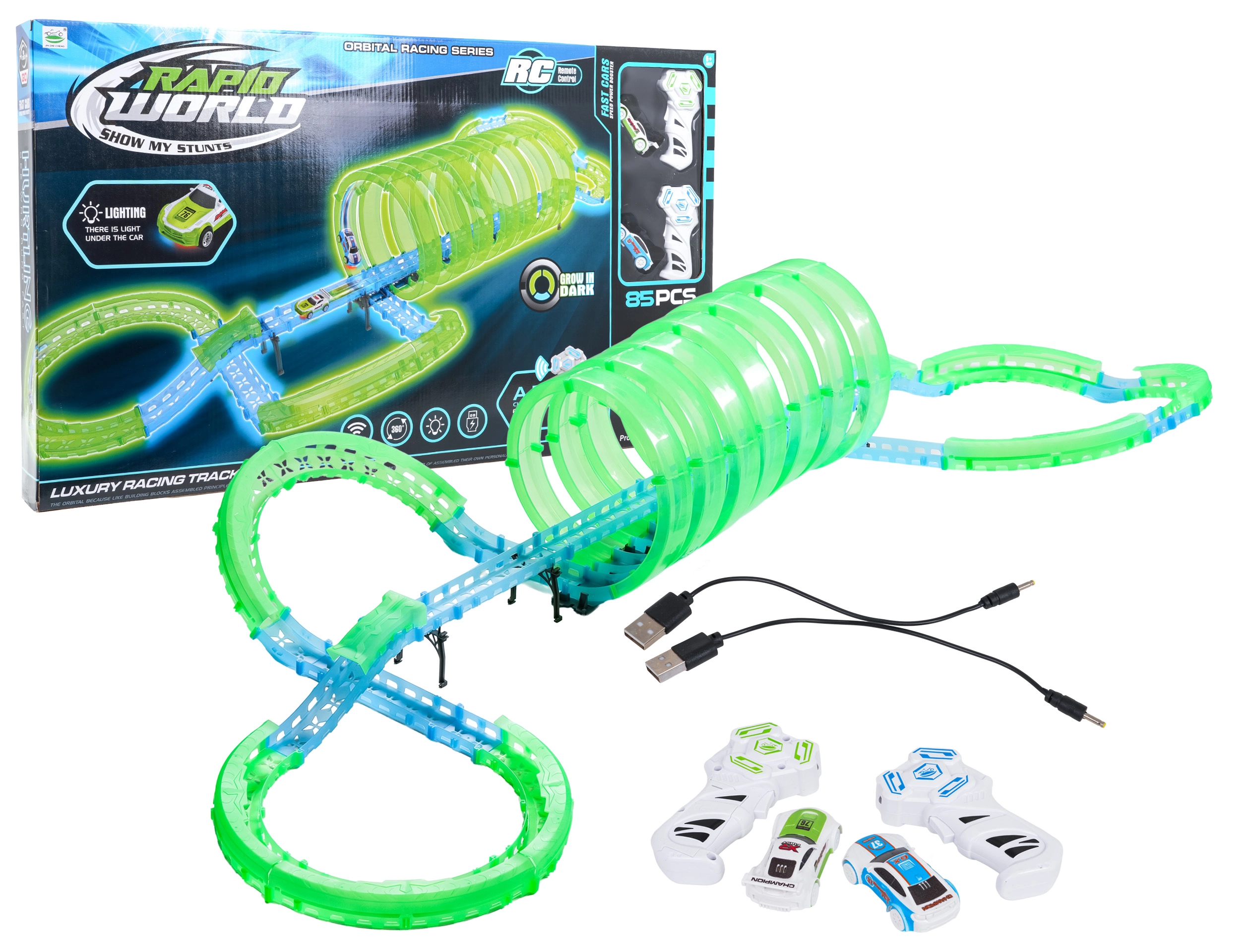 - USB-opladen: comfortabel laden van de autootjes (3,7 V accu’s inbegrepen).