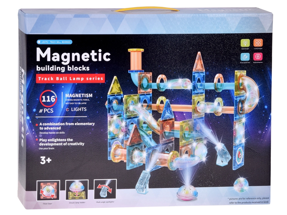 Creatieve magnetische bouwset met lichtelementen en transparante buizen waarmee kinderen een knikkerbaan, torens en tunnels kunnen bouwen. Dankzij 116 onderdelen met sterke magneten is bouwen eenvoudig en intuïtief; lichtgevende knikkers en spotlights zorgen voor een spectaculair schouwspel, vooral bij schemering. Geweldig voor STEM-leren, ontwikkeling van logica en fijne motoriek.