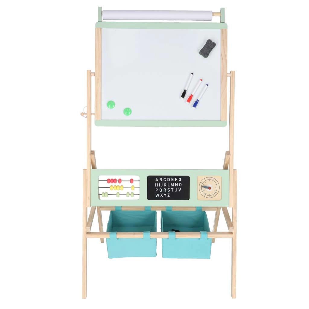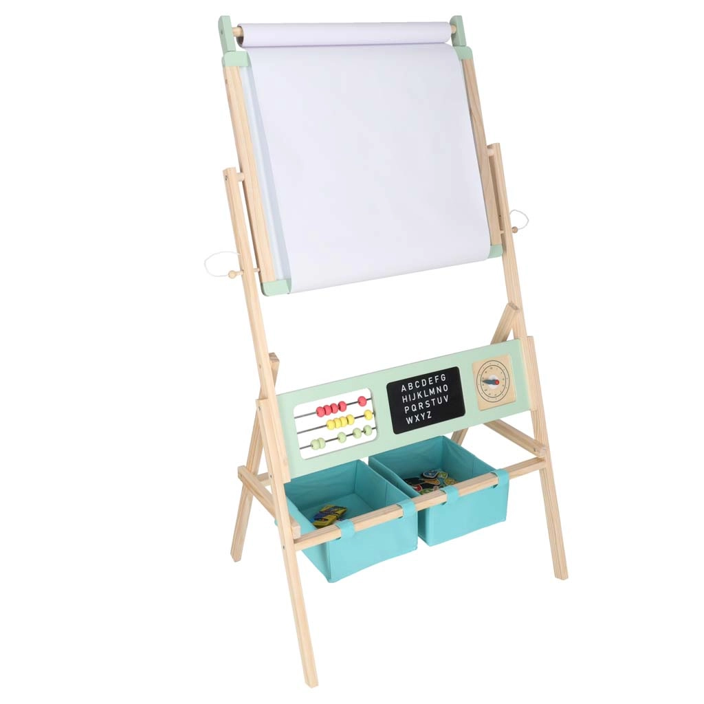 De houten constructie is stabiel en duurzaam, en de twee textiele vakken houden alle benodigdheden binnen handbereik. De set bevat ook krijtjes, waskrijtjes, magnetische stiften, een uitwis-spons en magneten – uitpakken en creëren maar.