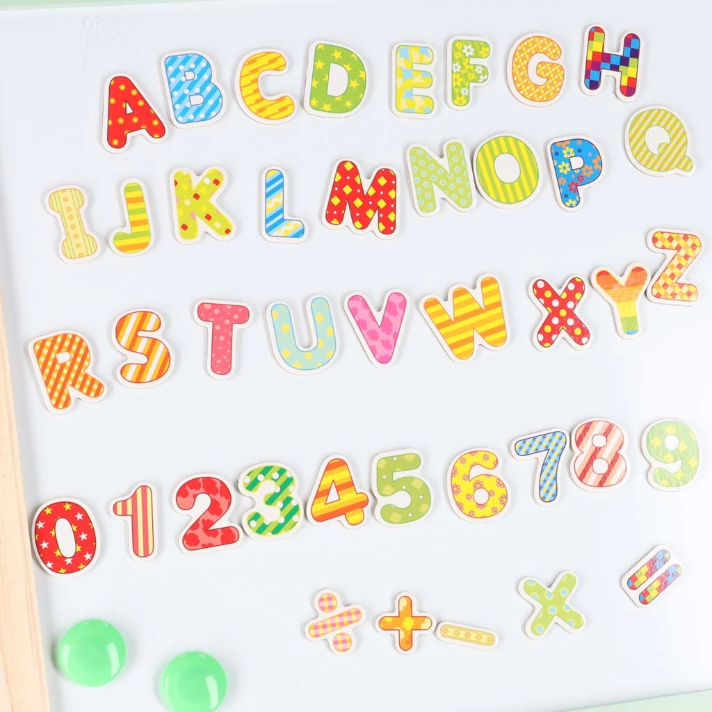 Houten dubbelzijdig bord 3-in-1 met 2 textiele manden, 6× krijt, 6× waskrijt, 2× magneet, 3× magnetische marker, uitwis-spons, 41 magneten (letters en cijfers)