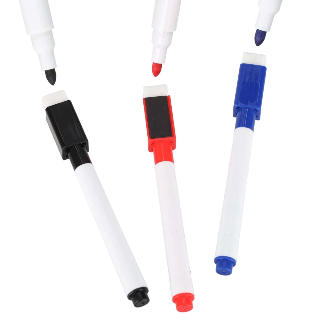 Twee textiele manden houden alles netjes. In de set vind je krijtjes, waskrijtjes, 3 magnetische stiften met wisser, een uitwis-spons, magneten en een set letters en cijfers.