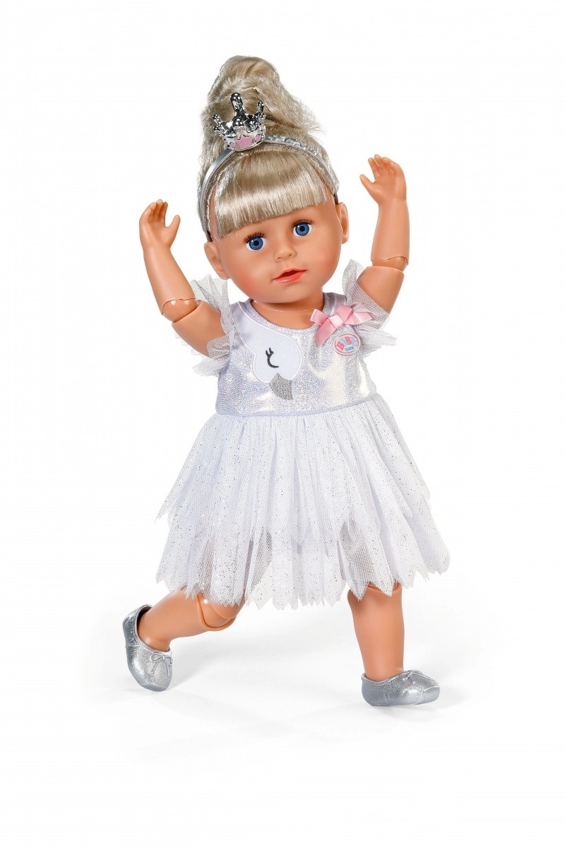 Laat elke dansvoorstelling stralen met de BABY born balletset voor poppen van 43 cm. Bevat een glinsterende witte tutu-jurk met een zwaanmotief en strikje, zilveren balletschoentjes en een kroontje voor een betoverende look. Een geweldige accessoire voor creatief en langdurig speelplezier, ook compatibel met BABY born Teddy.