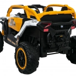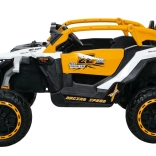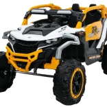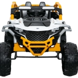 Stijlvolle elektrische kinderauto in geel-witte kleur voor een realistische offroad-rijervaring. Dankzij de 4x4-aandrijving, brede terreinbanden en robuuste constructie ideaal voor spelen in de buitenlucht. LED-verlichting, een stuur met eenvoudige bediening en twee zitplaatsen zorgen voor een veilige en leuke rit voor jonge bestuurders.