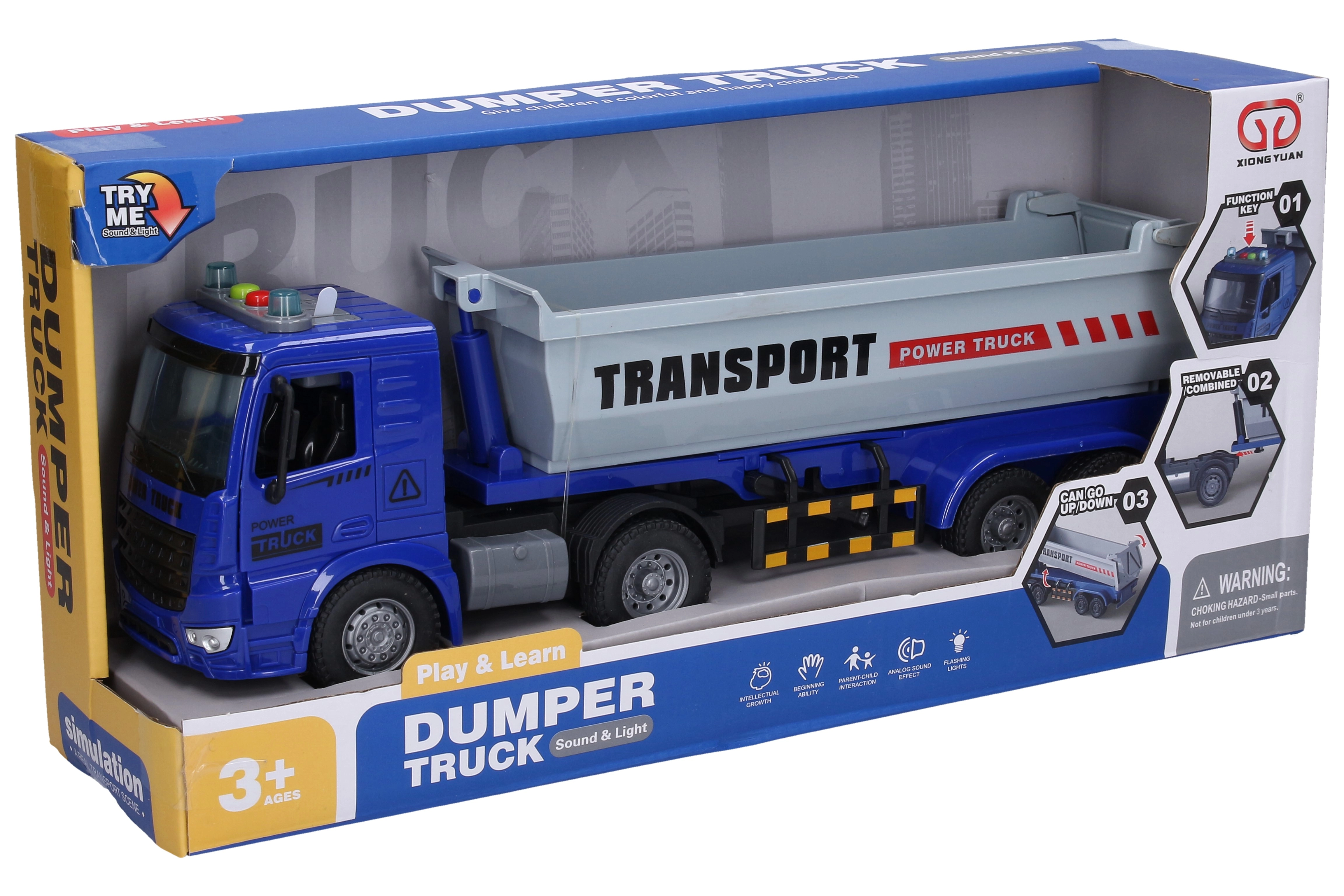 Druk gewoon: knop 1 start het motorgeluid en het kiepen, knop 2 activeert het achteruitrijgeluid en toeteren. De afkoppelbare oplegger vergroot de speelmogelijkheden – rij met of zonder oplegger. Batterijen zijn inbegrepen, dus het plezier kan meteen beginnen.