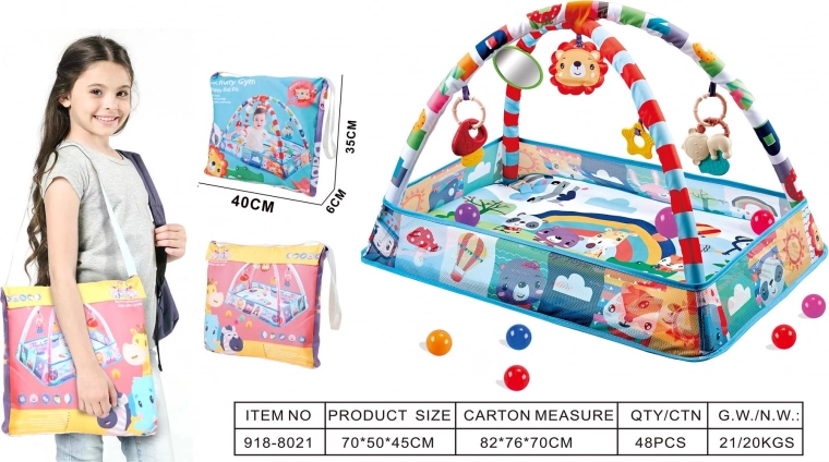 De afneembare boog is uitgerust met diverse speeltjes: een veilig spiegeltje, een paddenstoel met rammelaar en bijtring, een bij met bijtring en rammelaar, een losse bijtring en een leeuwtje met pieper. De mat kan gemakkelijk worden omgebouwd tot een box of ballenbak en aangevuld met de meegeleverde balletjes. De hele set is verpakt in een kleurrijke schoudertas voor handig meenemen.