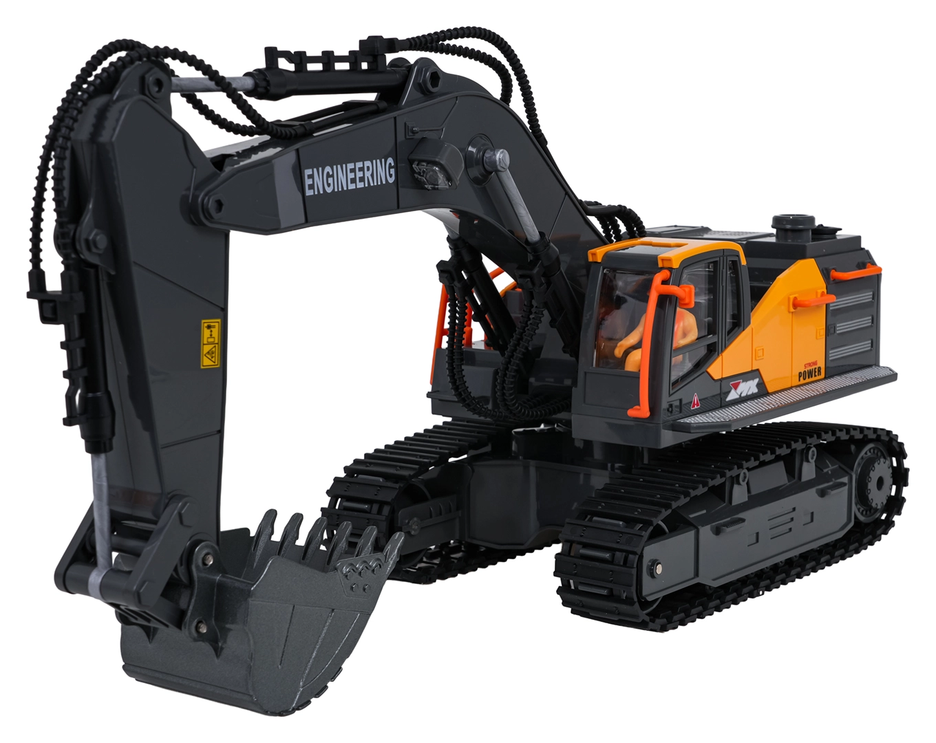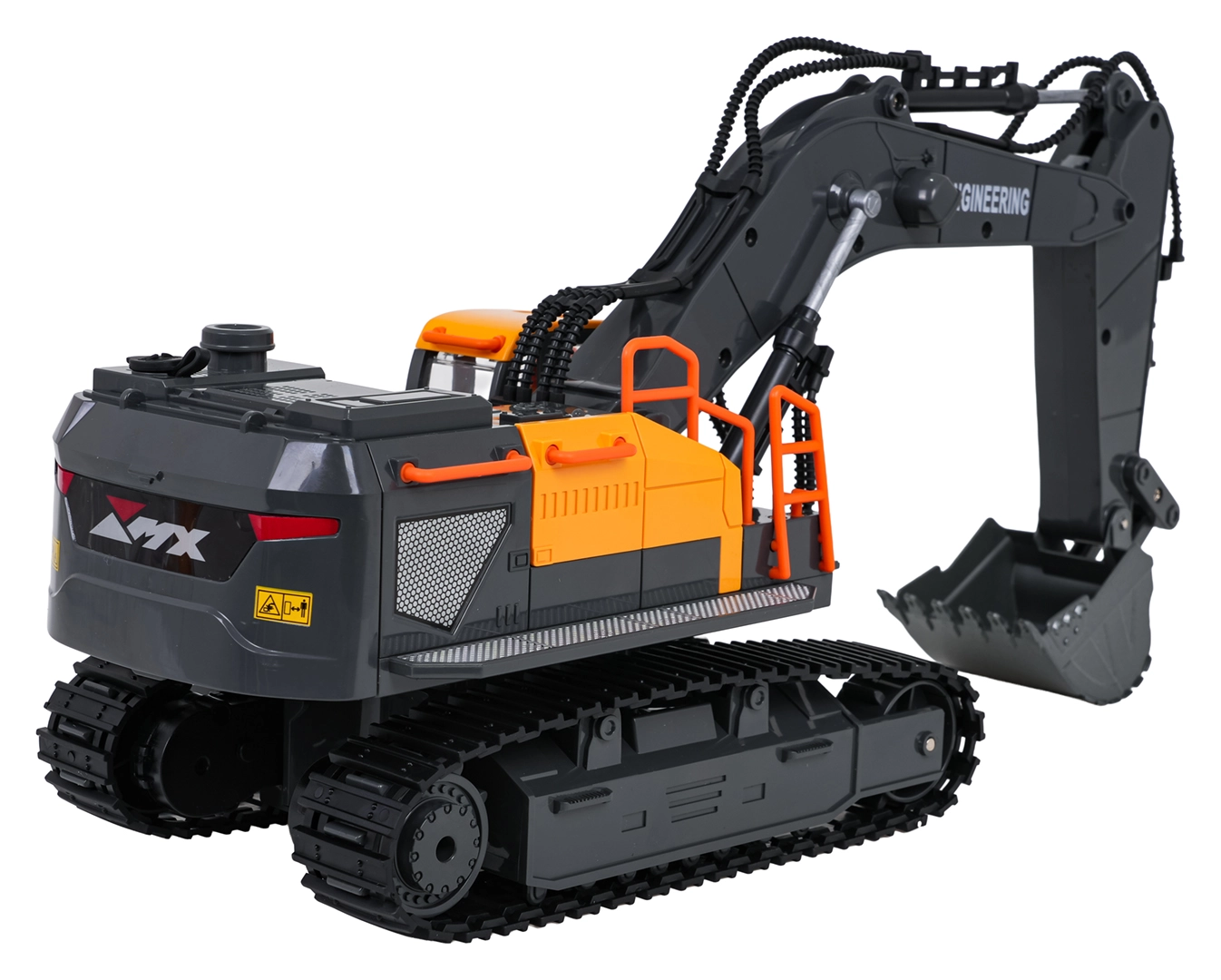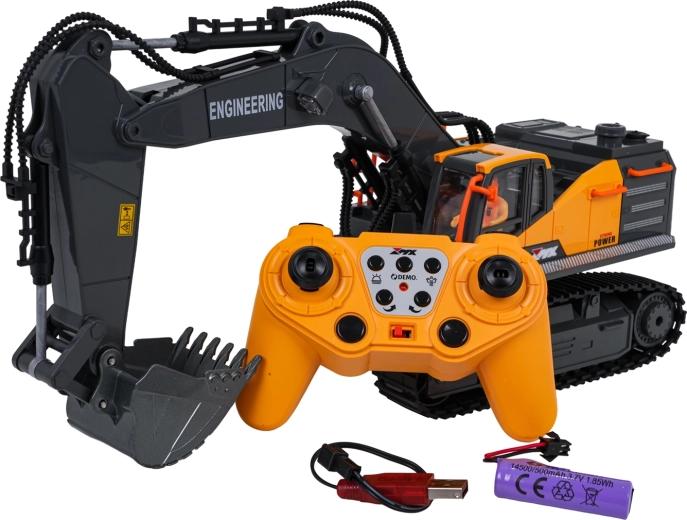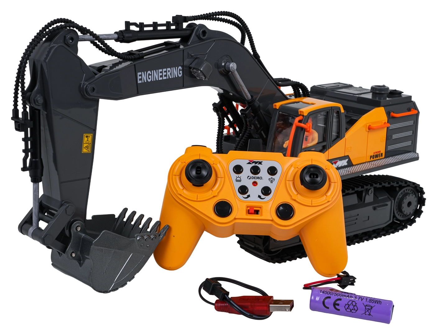 De bediening op 2,4 GHz zorgt voor een stabiel bereik zonder storingen; de graafmachine rijdt vooruit, achteruit, naar rechts en links. Er is een demomodus, bedrijfs- en achteruitrijgeluiden met de mogelijkheid om geluid en licht uit te schakelen. Voeding via de meegeleverde oplaadbare 3,7 V-accu, opladen via USB.