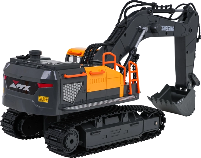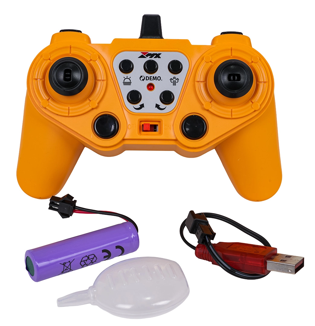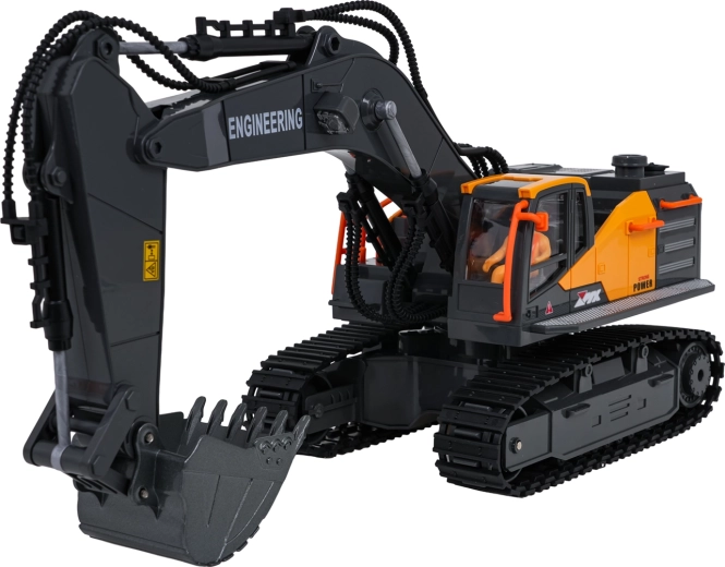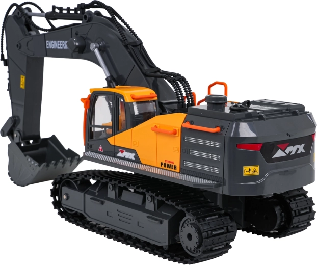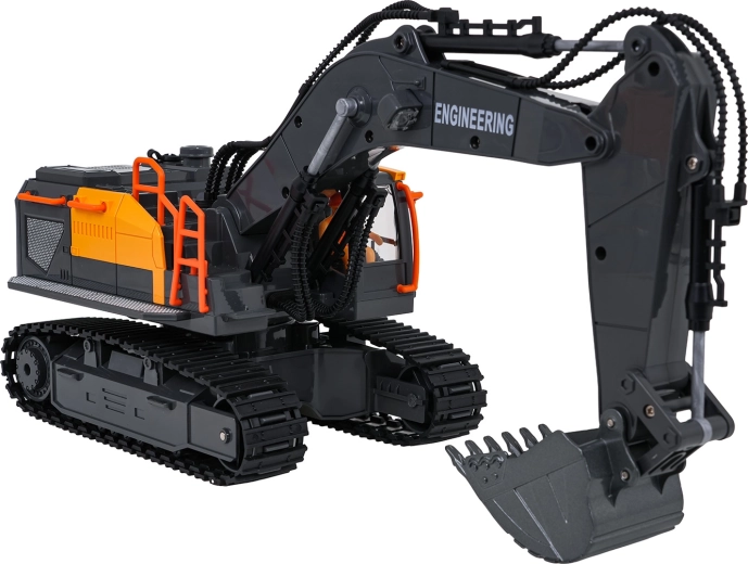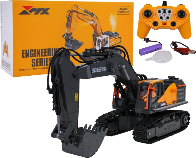 De bediening op 2,4 GHz zorgt voor een stabiel bereik zonder storingen; de graafmachine rijdt vooruit, achteruit, naar rechts en links. Er is een demomodus, bedrijfs- en achteruitrijgeluiden met de mogelijkheid om geluid en licht uit te schakelen. Voeding via de meegeleverde oplaadbare 3,7 V-accu, opladen via USB.