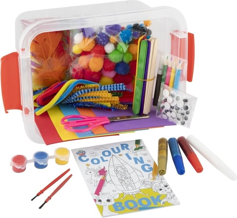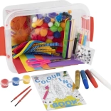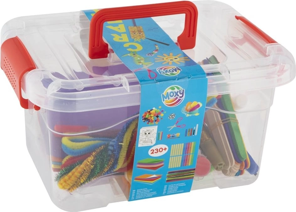 Stimuleer de fantasie van kinderen met de uitgebreide knutselset MOXY! Je vindt hierin ongeveer 240 onderdelen, waaronder pijpenragers, veertjes, pompons, glitterlijm, penselen, verf en papier. De set is ideaal voor kinderen vanaf 3 jaar die graag knutselen en met verschillende materialen experimenteren. Alles is opgeborgen in een praktisch doosje van 24 × 18 × 12 cm voor eenvoudig meenemen en netjes opbergen.