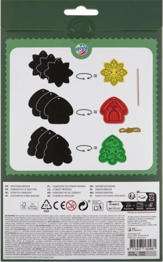 Dankzij de meegeleverde koordjes kun je de afgewerkte decoraties gemakkelijk ophangen in de boom, aan een krans, voor het raam of aan cadeautjes bevestigen. De krastechniek stimuleert creativiteit, geduld en fijne motoriek, ideaal voor knutselen in de aanloop naar Kerst, thuis, in de peuterspeelzaal of op school.
