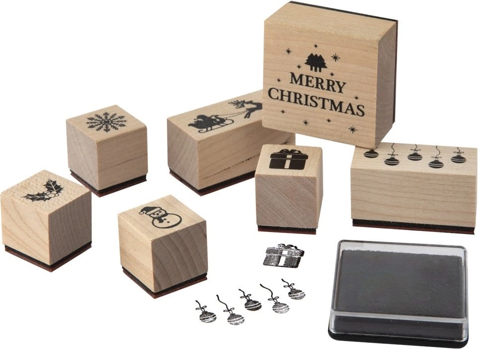 Maak originele feestelijke decoraties en kaarten met deze veelzijdige set van 7 houten stempels met kerstmotieven. Ideaal voor papier, karton en andere oppervlakken, met een comfortabel houten handvat voor eenvoudig en nauwkeurig stempelen. Perfect voor het maken van kerstkaarten, decoraties en inpakpapier. Na gebruik volstaat het om met water af te spoelen om te voorkomen dat de inkt indroogt.