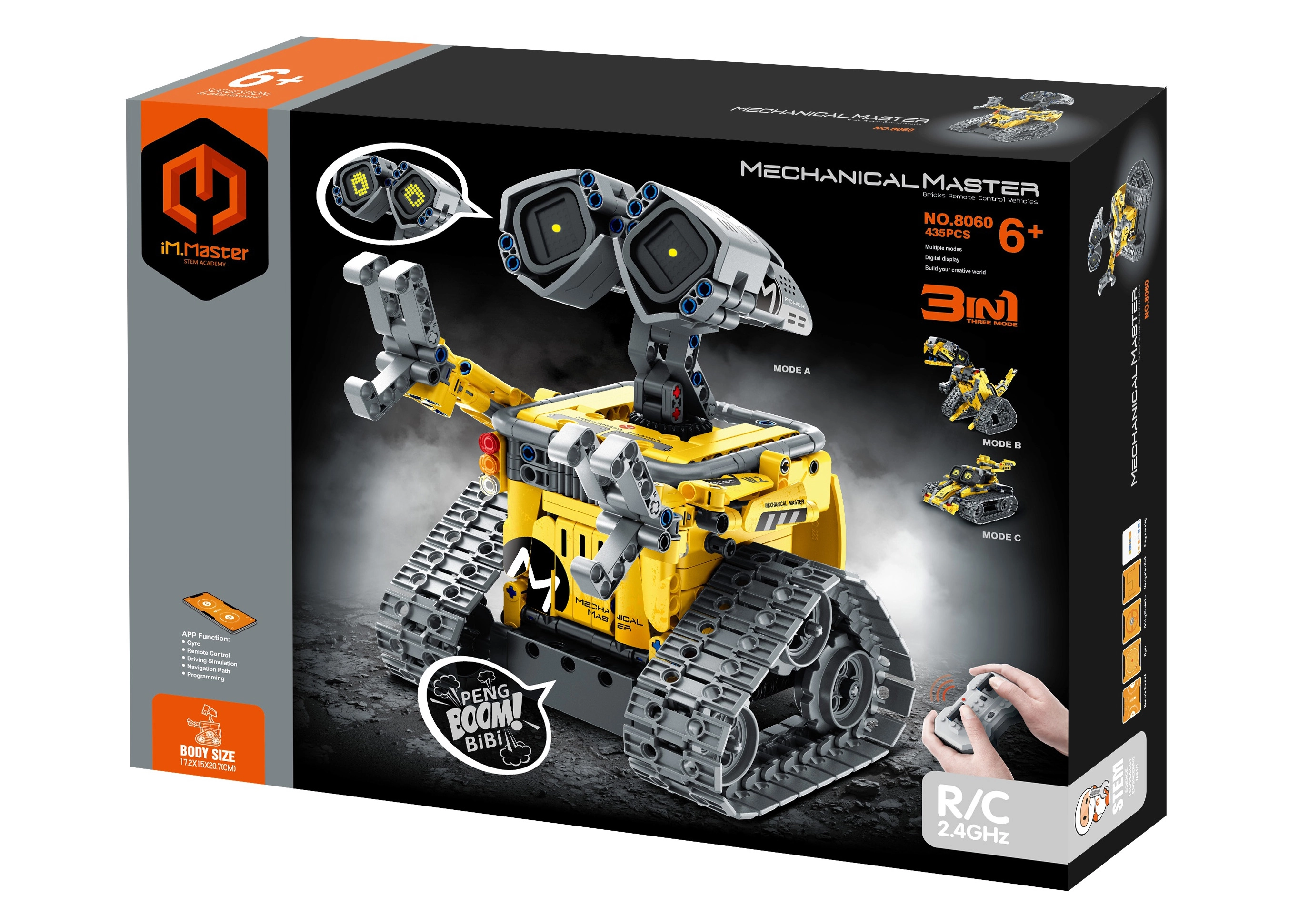 Ontdek het plezier van bouwen én besturen met de veelzijdige iM.Master bouwset. Met 435 onderdelen bouw je drie verschillende modellen en dankzij de stabiele 2,4 GHz-frequentie en Bluetooth bedien je de robot zowel met een afstandsbediening als met een smartphone. Licht- en geluidseffecten brengen je creaties tot leven.