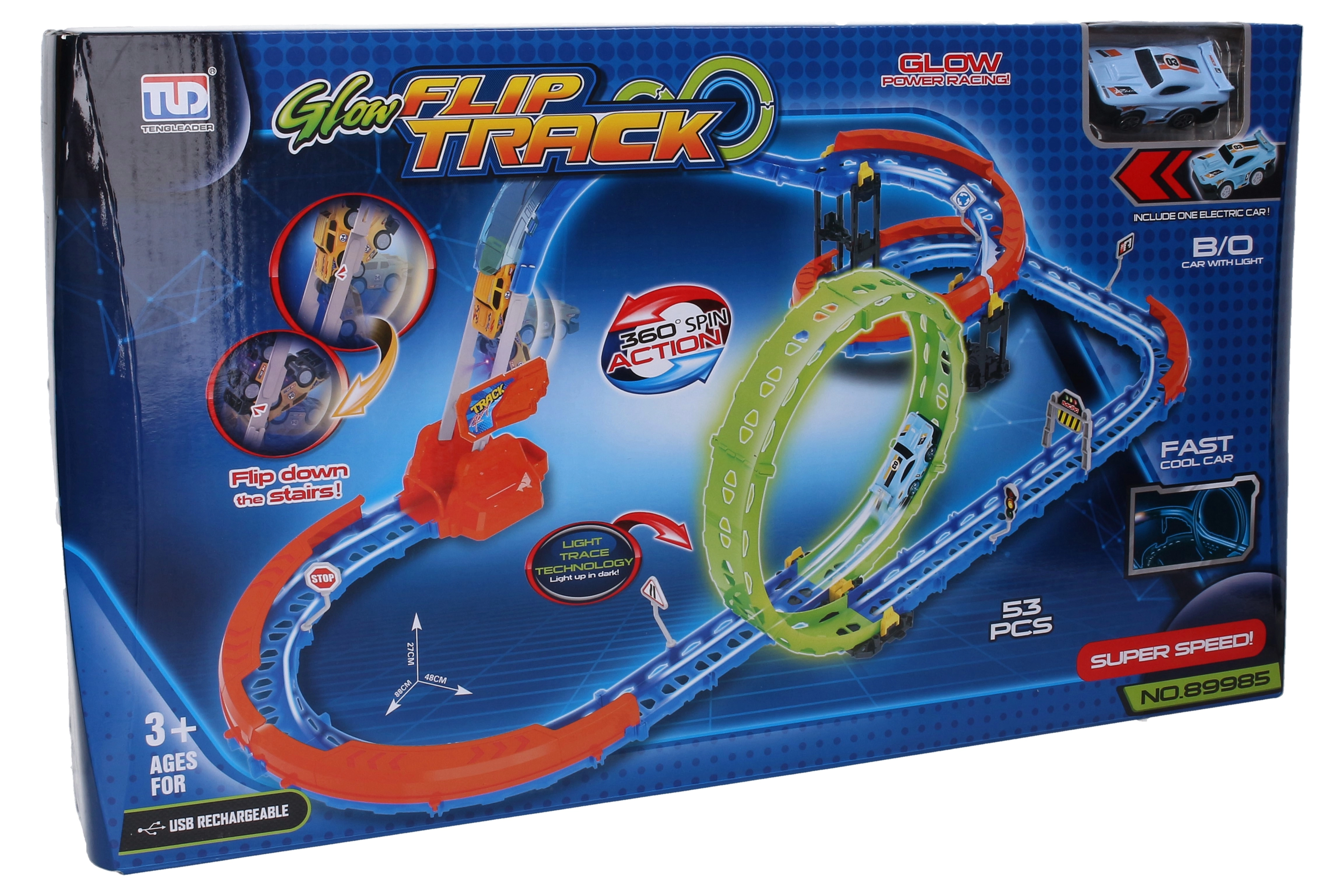 Geniet van een dynamische rit met een baan die opvalt door het lichtgevende autootje en compacte afmetingen die ideaal zijn voor de kinderkamer. De gemonteerde baan meet 88 × 27 × 48 cm en biedt een geweldige balans tussen plezier en ruimte.