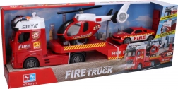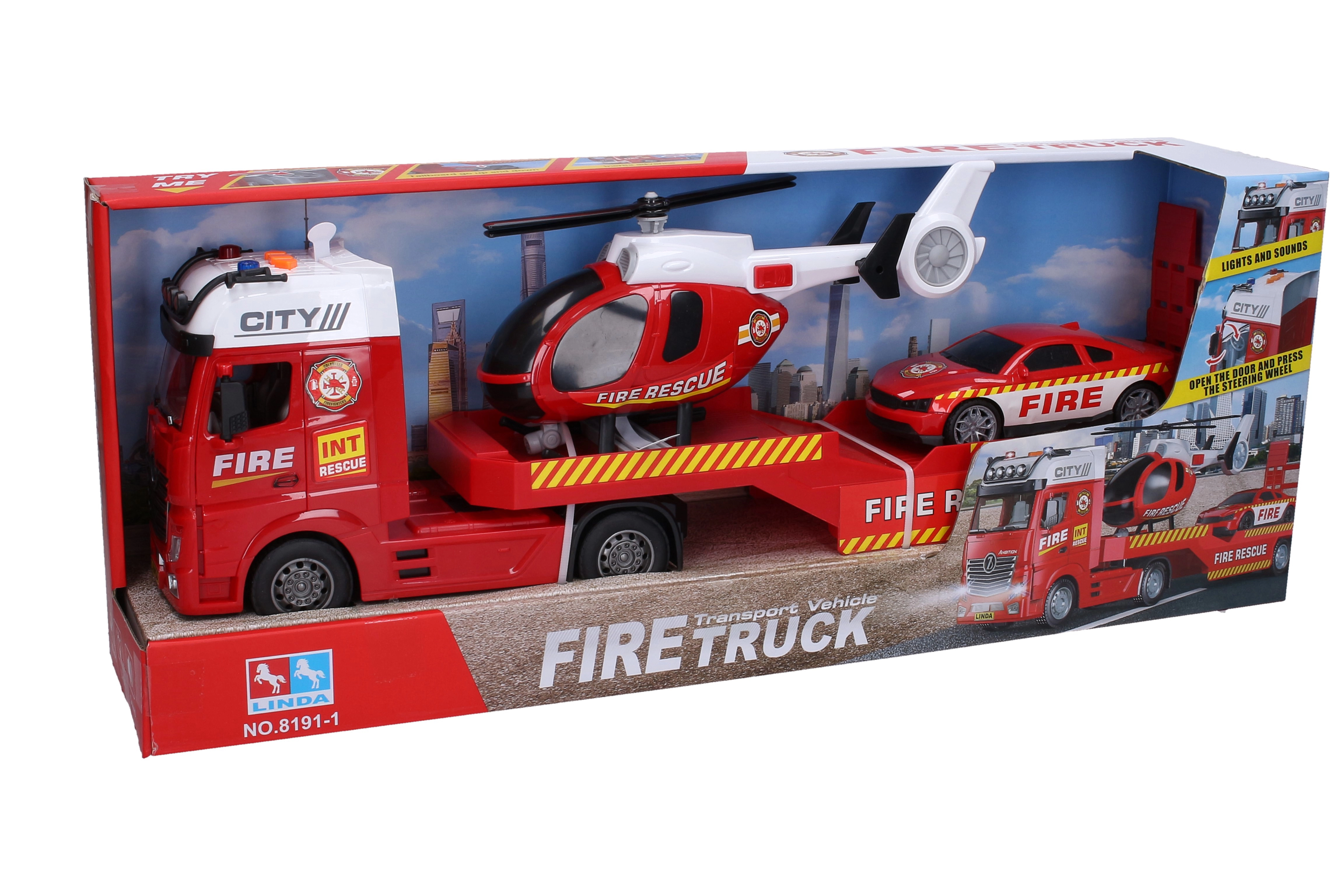Beleef actie zoals bij echte brandweerlieden! Deze gedetailleerde set combineert een lange trekker, een helikopter en een interventieauto. Dankzij de traagheidsaandrijving rijdt de trekker gemakkelijk weg en voor een realistische beleving zorgen de zwaailichten, sirene, achteruitrijgeluid en motorgeluid, die worden geactiveerd met knoppen op het dak. De helikopter heeft eigen geluidseffecten die worden bediend met een knop aan de zijkant.