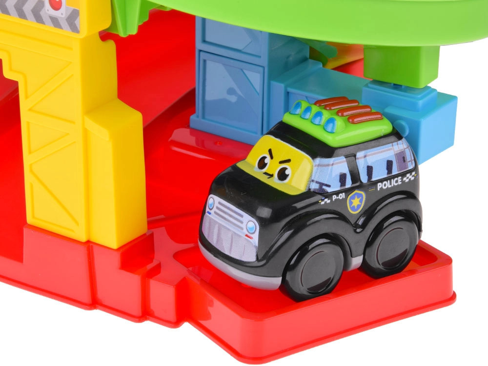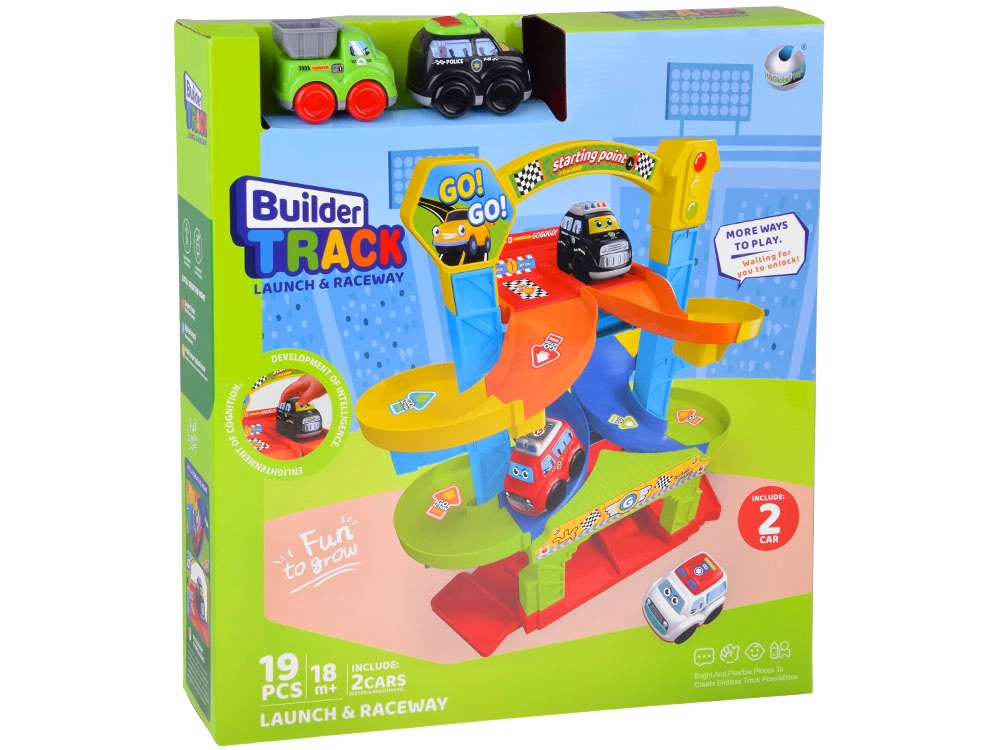 De baan is makkelijk te monteren en om te bouwen, zodat je de indeling en de kleuren van de segmenten naar wens kunt veranderen. Kwalitatieve, veilige materialen en afgeronde randen zijn geschikt voor de allerkleinsten. In de doos zitten twee autootjes – een politievoertuig en een groene kiepwagen, die soepel rijden over de brede hellingen.