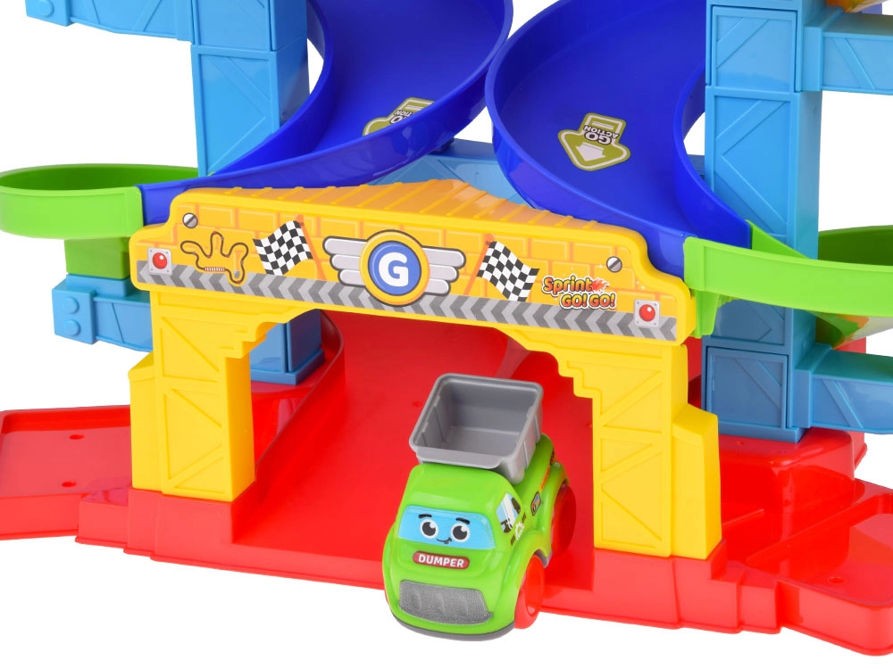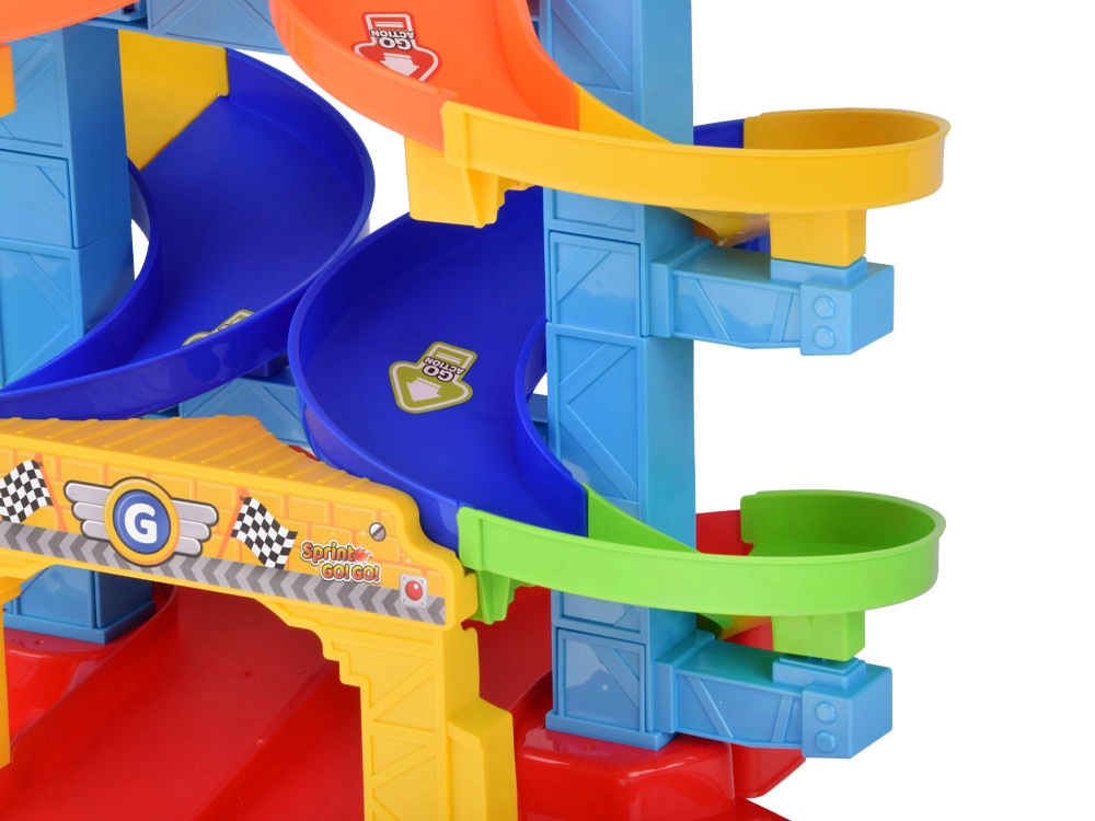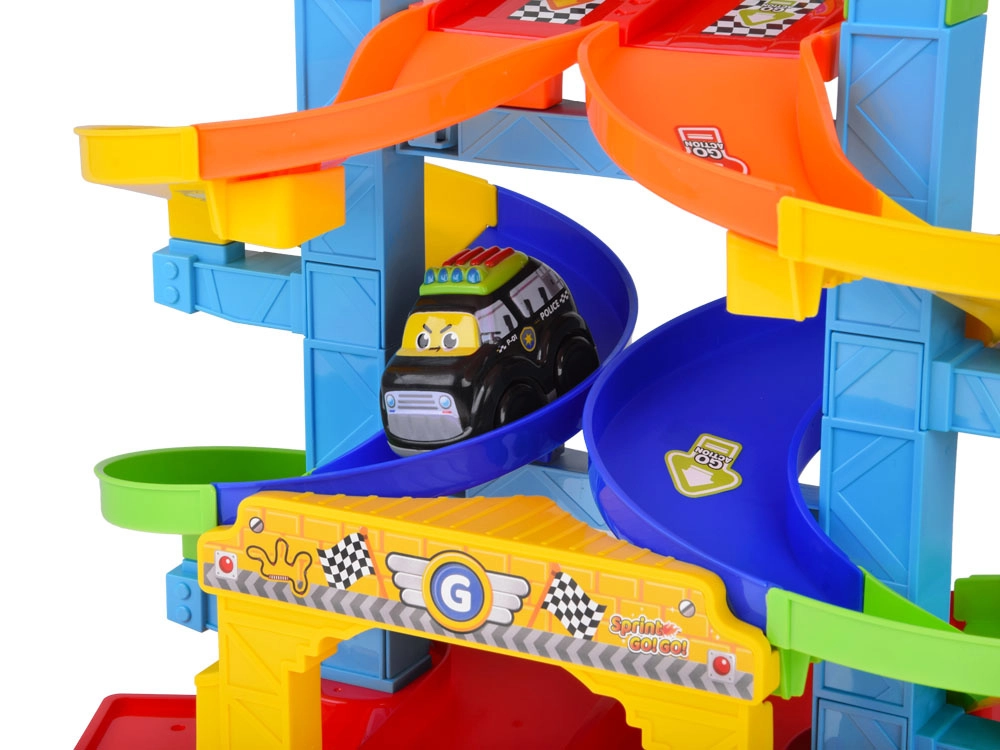 Kleurige, gedraaide banen leiden de autootjes veilig naar beneden. Stevige kolommen en brede randen zorgen voor een vloeiende rit zonder vastlopen.