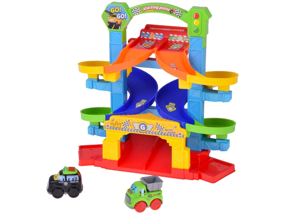 Kleurige spiraalracebaan met meerdere niveaus en twee schattige autootjes biedt uren speelplezier en ontwikkeling. Dankzij de eenvoudige montage en het veilige ontwerp genieten kinderen van het kijken hoe de autootjes over de gedraaide hellingen naar beneden zoeven. Inclusief 2 voertuigen (politie en kiepwagen), meerniveaus draaiende afdaling, startpoort en duurzame kunststof constructie, ideaal vanaf 18 maanden.