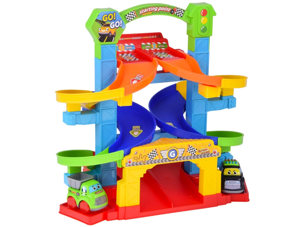 Deze spiraalracebaan is een uitstekende keuze voor de eerste races van kleine chauffeurs. Kleurige spiraalbanen, een startpoort en stabiele pilaren zorgen voor een vloeiende rit van de autootjes van boven naar beneden. Tijdens het spelen oefenen kinderen oog-handcoördinatie, ontwikkelen ze logica en verbeelding en leren ze tegelijk over oorzaak en gevolg.