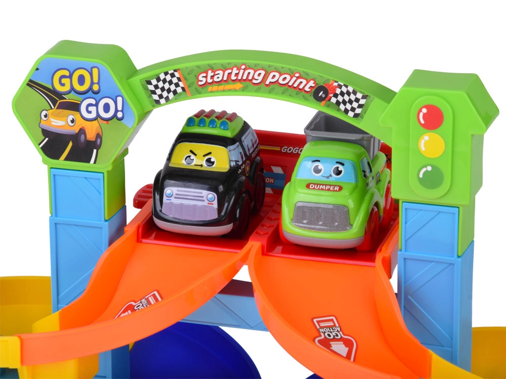 De dubbele starttoren met “starting point” en hendel laat twee autootjes tegelijk vertrekken. Kinderen beleven een spannende start en kunnen zij aan zij racen.
