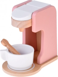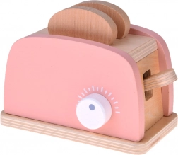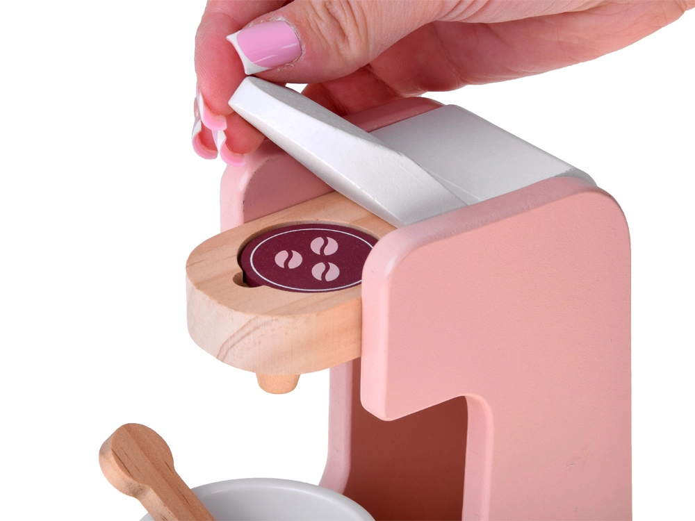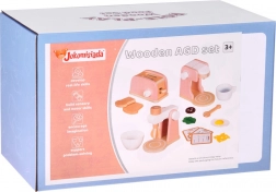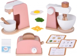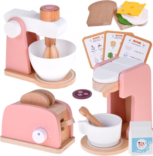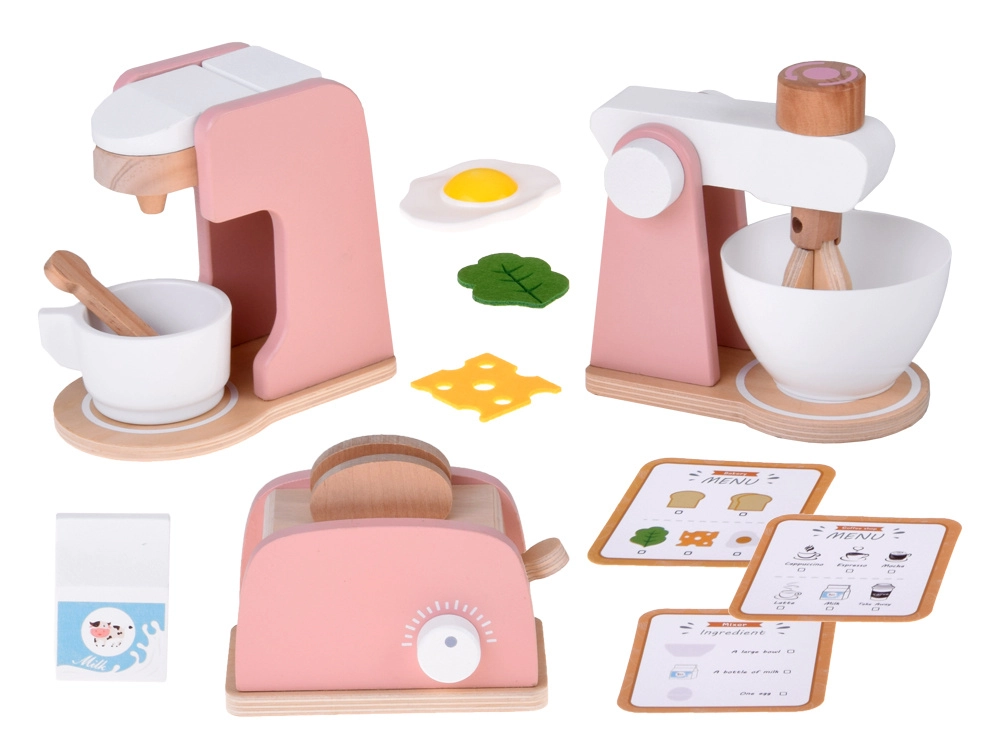 Een stijlvolle houten set klein huishoudelektro brengt de kinderkeuken naar een wereld vol fantasie. Bevat een broodrooster met hendel en draaiknop, een koffiezetapparaat met kopje, lepeltje en capsule en een staande mixer met kom en draaiende garde-opzet. Hoogwaardig natuurlijk hout, niet-giftige verven en een pastelkleurig design zorgen voor veilig en prachtig spel dat fijne motoriek, creativiteit en rollenspel stimuleert.