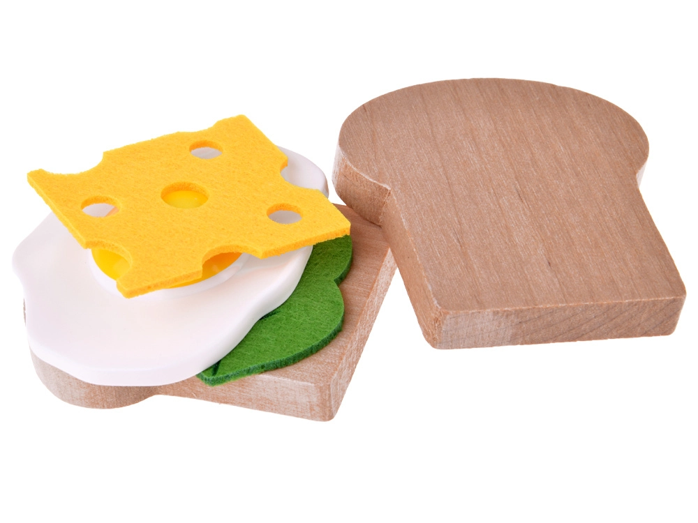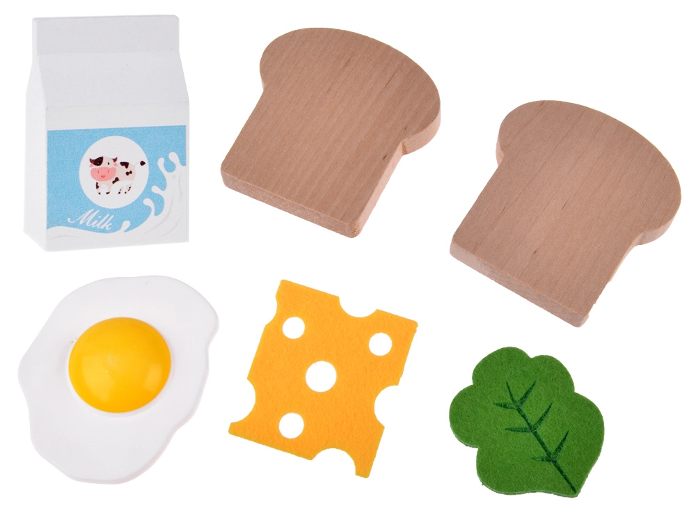 Inclusief rijk assortiment accessoires: houten sneetjes brood, een nep ei, een plak kaas, een blaadje sla, een melkpakje, een koffiecapsule en menu-/receptkaarten voor nog leuker spel.