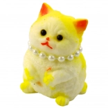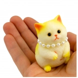 Schattig wit-geel katje van zacht siliconen, ideaal als antistress-speelgoed voor kinderen en volwassenen. Dankzij het soepel, elastisch materiaal knijpt het prettig, helpt het spanning los te laten en verbetert het de stemming. De elegante parelketting en de realistische vachttextuur maken het ook een mooie decoratie voor op tafel of in de kast.