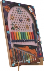 Het kleurrijke speelbord met pinnetjes, banen en scorevakken ontwikkelt fijne motoriek, oog-handcoördinatie en geduld bij elke poging.