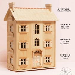 Dit hoge poppenhuis van gecertificeerd FSC-hout is ontworpen om langdurig en creatief spel te inspireren. Dankzij de verfijnde details en volledig functionele elementen – openende ramen, luiken en deuren – creëren kinderen eenvoudig hun eigen verhalen en fantasiewerelden die ze jarenlang kunnen delen.