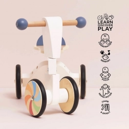 Dit stijlvolle vervoermiddel is met de hand nabeschilderd met milieuvriendelijke verven op waterbasis en voldoet aan de strengste veiligheidsnormen. De regenboogwielen van zacht rubber zorgen voor een stille en vloervriendelijke rit. Het loopfietsje stimuleert actieve beweging, cognitieve vaardigheden en fantasierijk spel.