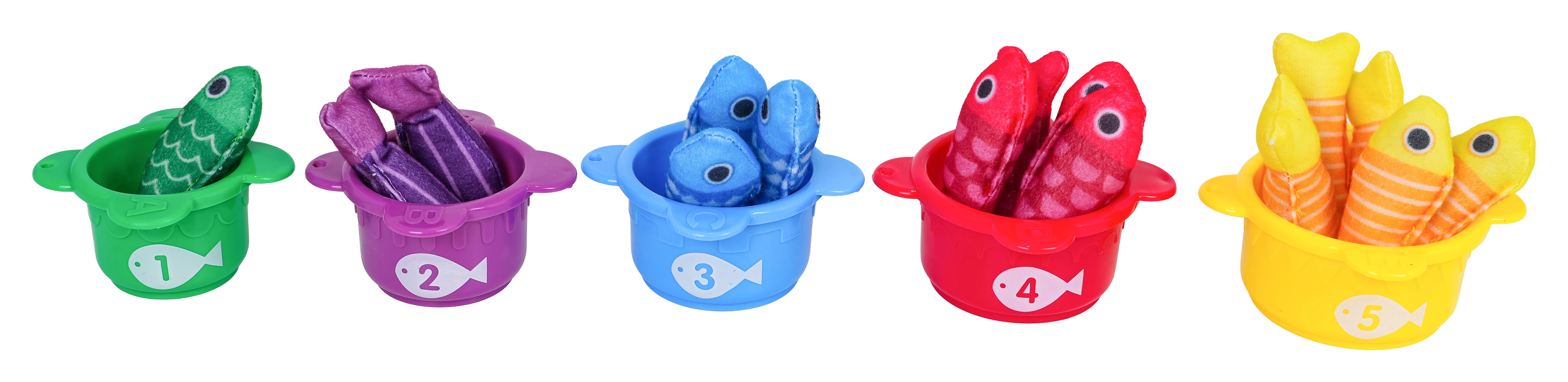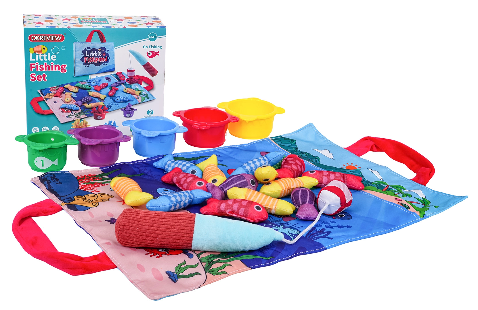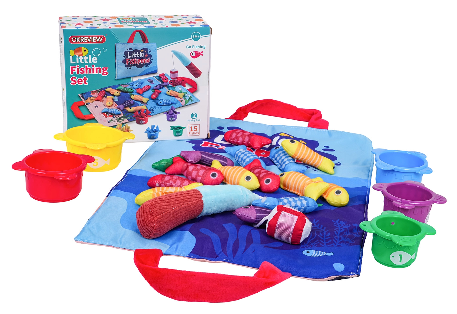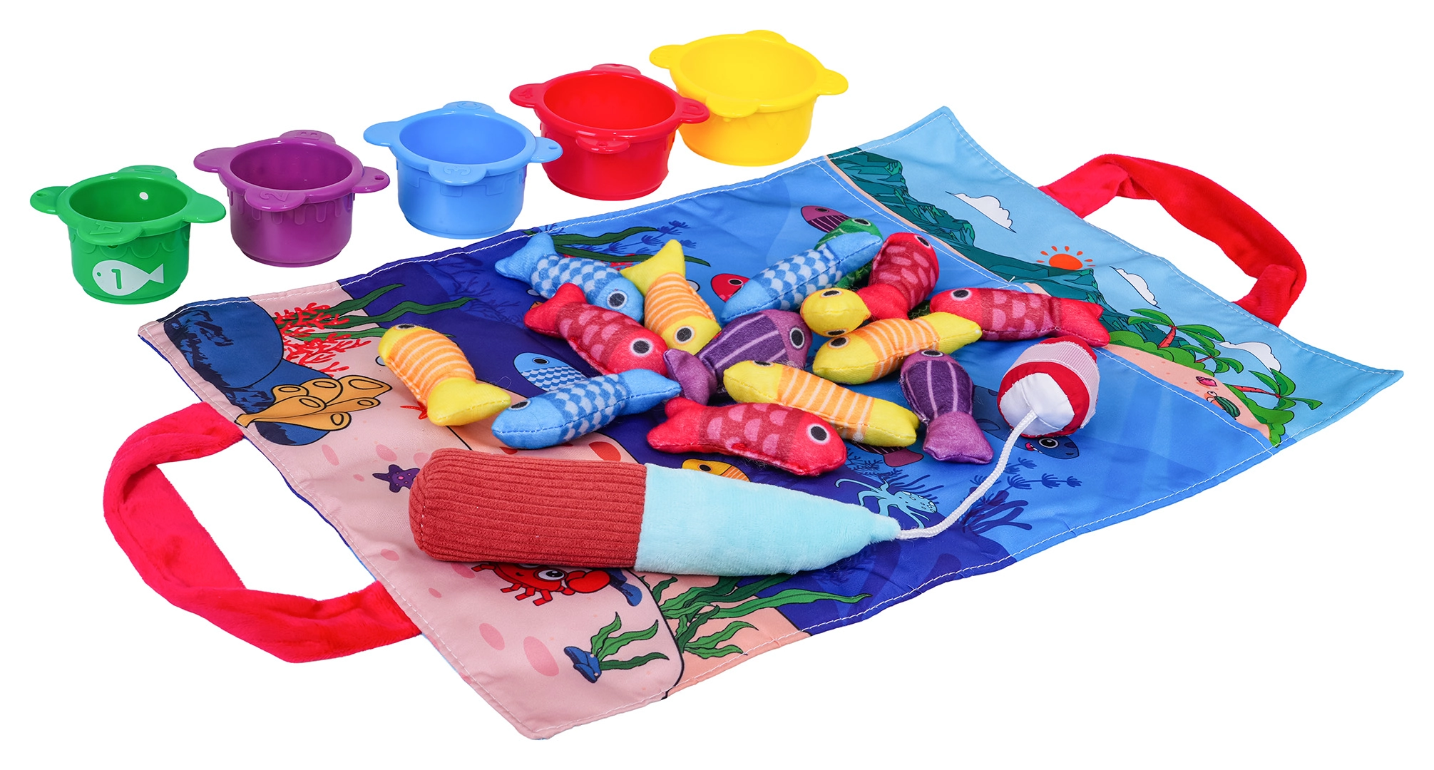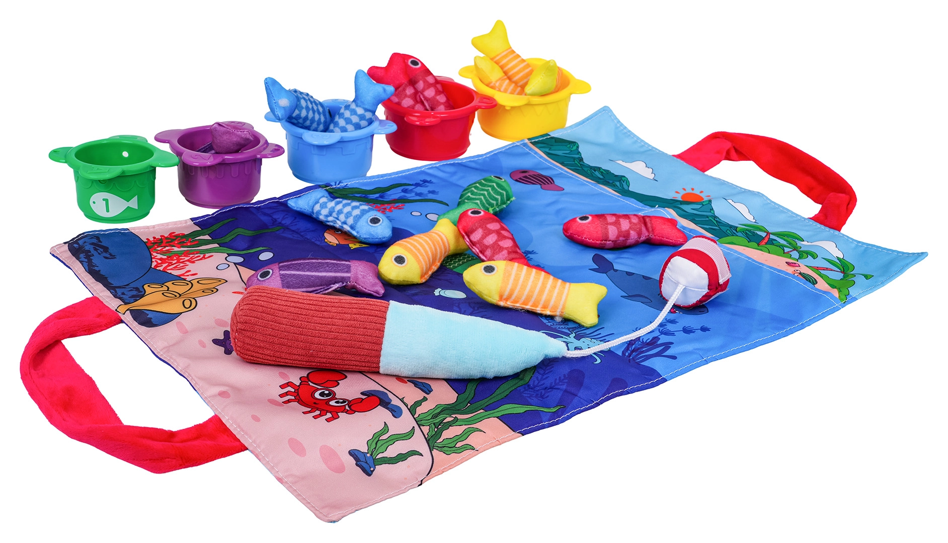 Ontdek een speelse activiteit voor de allerkleinsten: een zachte visset met een stoffen speelmat, 15 visjes, 5 bekertjes en een zachte hengel met klittenband. Stimuleert de ontwikkeling van de fijne motoriek, oog-handcoördinatie, kleuren- en cijferherkenning en sorteren en tellen. De praktische mat met handgrepen voor dragen dient ook als tas om de hele set in op te bergen.