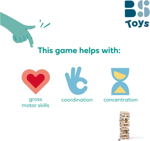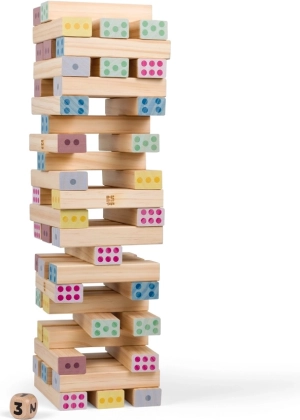 De reusachtige cijfertoren verandert het klassieke balansspel in slimme entertainment die logisch denken en werken met getallen stimuleert. Houten blokken worden verwijderd volgens het getal op de dobbelsteen – ofwel één overeenkomend blok, of twee blokken waarvan de som overeenkomt. Dit zorgt voor dynamische speelbaarheid, spanning en een natuurlijke oefening in rekenen.