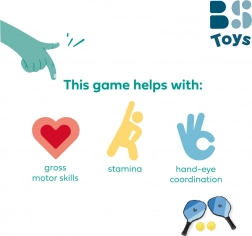 In de verpakking vind je complete uitrusting voor 2 spelers: 2 houten peddels (40 × 19 cm), 2 ballen, een draagbaar net en een tas voor gemakkelijk opbergen en transport. De regels leer je in een mum van tijd en je kunt spelen op een kleiner veld – bijvoorbeeld op het schoolplein of in de gymzaal.