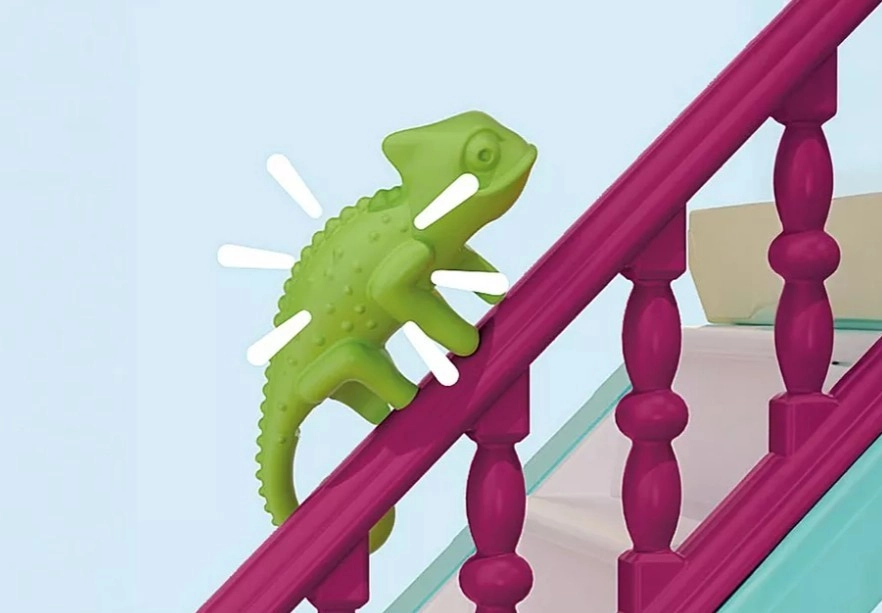 Er is een thuiseigen vijver voor het eendje en kikkertje, een geheime schuilplaats onder de trap voor de stokstaartjes, een boom voor het aapje en een rustig hoekje voor de kameleon. De uitgebreide set accessoires en meubels laat kinderen scènes arrangeren, voor de dieren zorgen en eindeloze verhalen creëren.