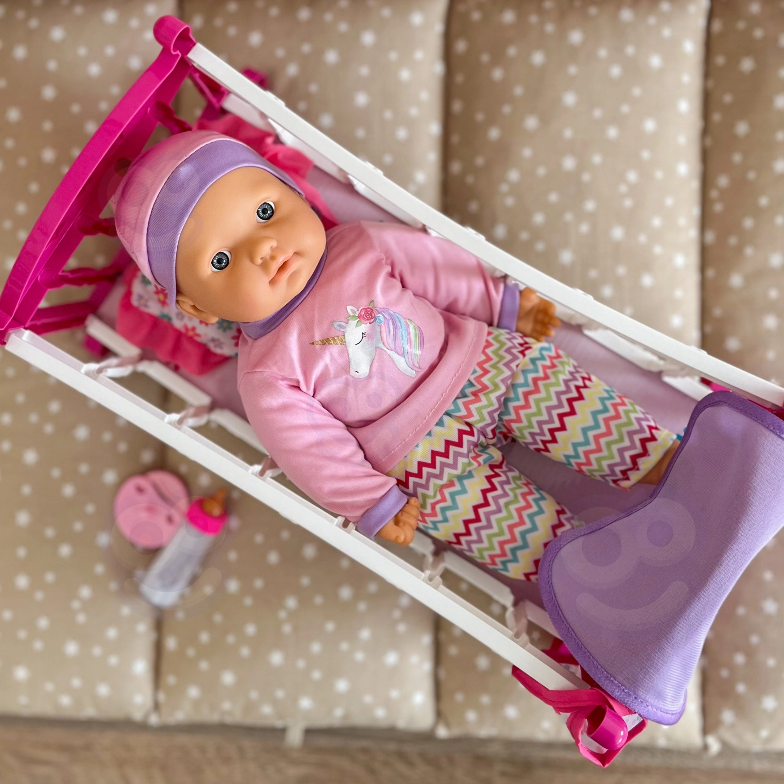 De roze-witte wieg met opengewerkte zijkanten en gebogen liggers schommelt zachtjes en helpt de pop in slaap te “wiegen”. Licht, stabiel en gemakkelijk te verplaatsen.