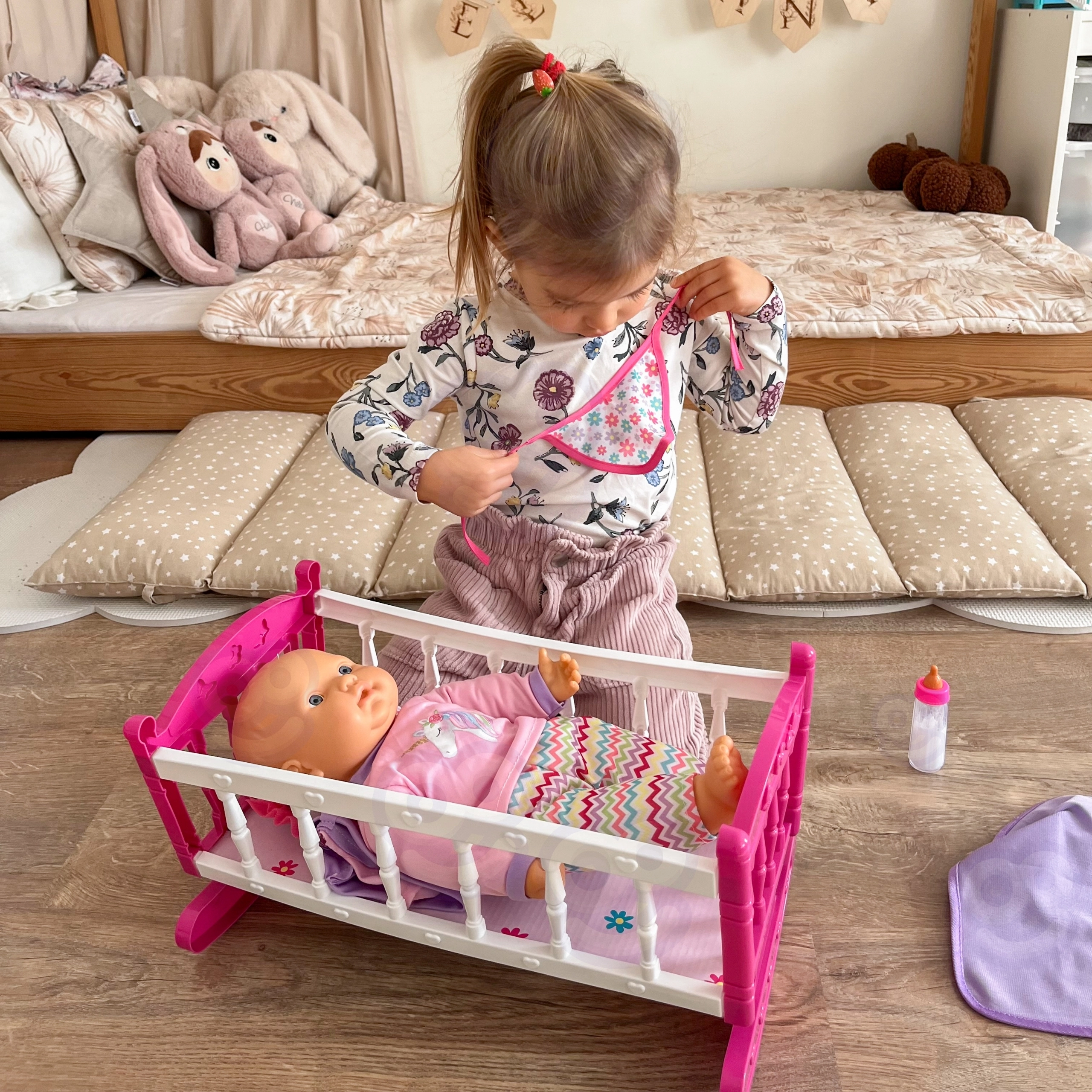Schommelwieg, rollenspel, pop voeden
