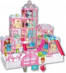 - Bouwbaar poppenhuis, pop, hondenfiguurtje, meubels en accessoires, tuintje met hek en poort, trap, glijbaan