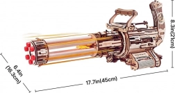 Het model bestaat uit 412 precies uitgesneden houten onderdelen en wordt zonder lijm in elkaar gezet. De voorste trekker zorgt voor de rotatie van de lopen, de bovenste trekker activeert het vuren – dubbele actie voor dubbel plezier. Na voltooiing krijg je een opvallend decoratief stuk dat schittert in elke collectie van technische en filmreplica’s.