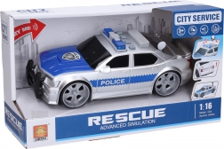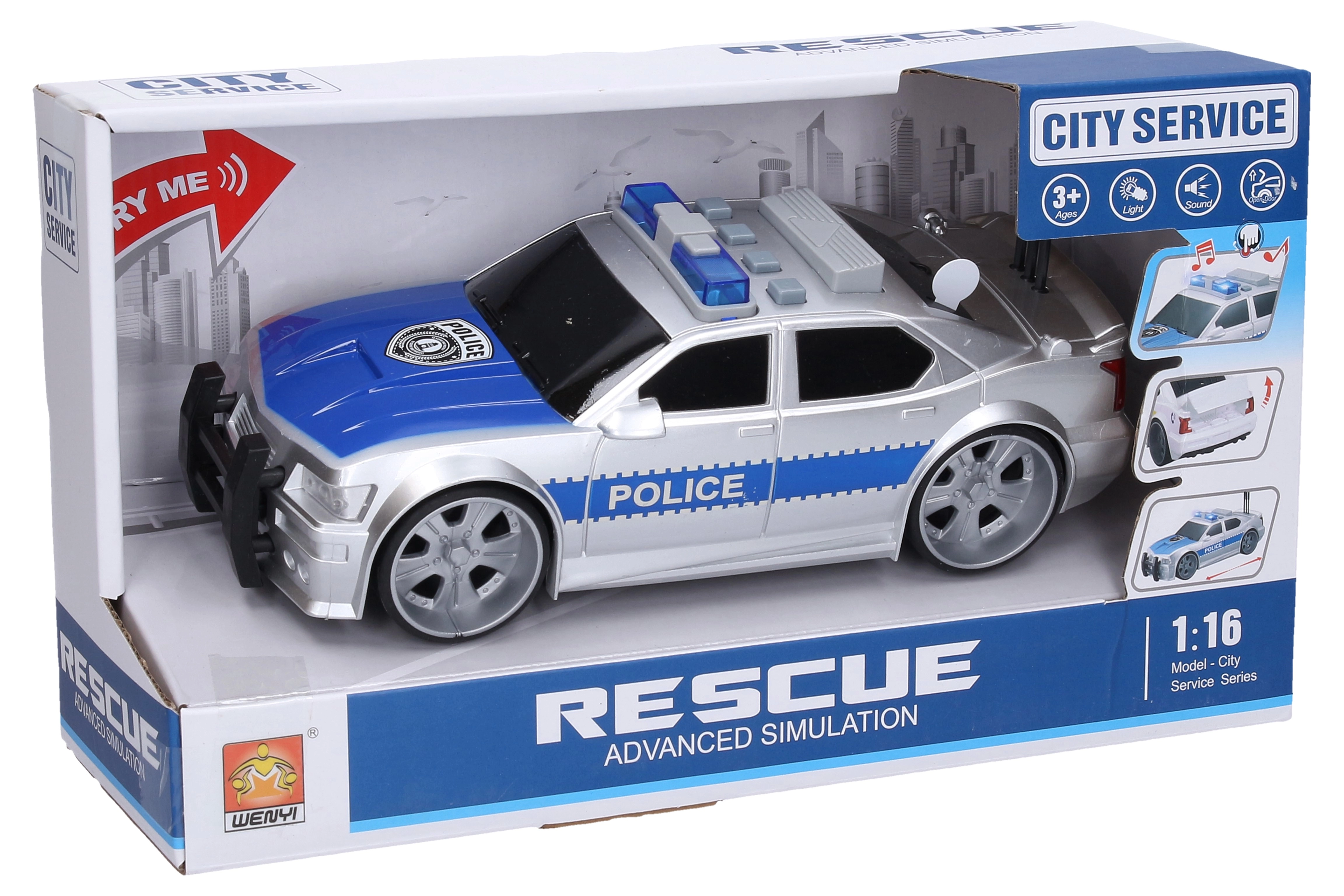 Ga op pad met deze gedetailleerde politiewagen van 27 cm lang. Dankzij de vliegwielaandrijving komt de auto makkelijk in beweging en de realistische licht- en geluidseffecten (motor, achteruitrijden, toeter, zwaailicht) maken elke actie nog leuker. De motorkap gaat open met een eenvoudige druk op de knop op het dak.