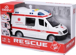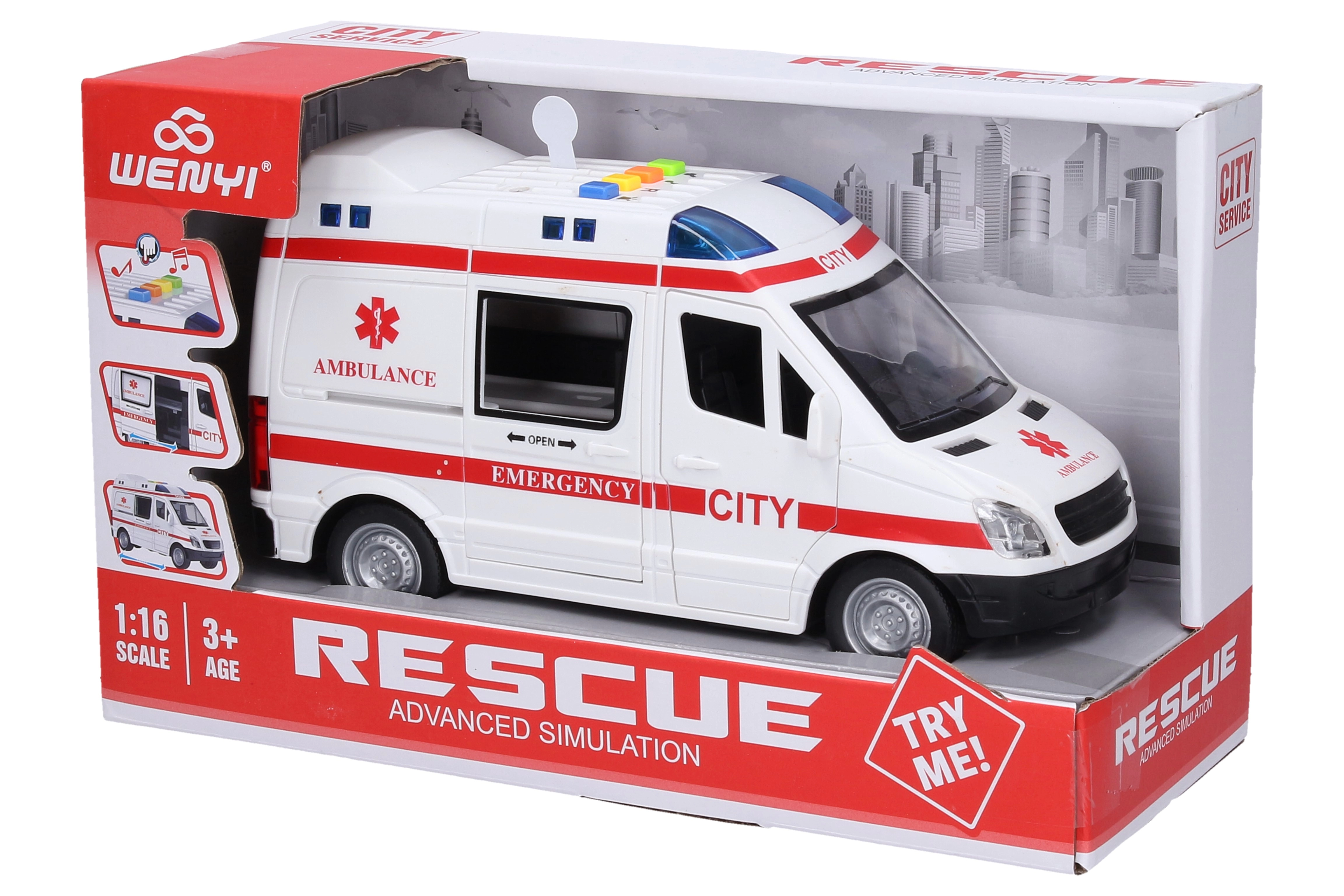 Deze gedetailleerd uitgewerkte ambulanceauto zal alle kleine chauffeurs en liefhebbers van hulpdiensten blij maken. Dankzij het vliegwiel rijdt hij makkelijk naar de interventie, de lichten en geluiden worden geactiveerd met knoppen op het dak en de te openen deuren ondersteunen realistische speelscenario’s.