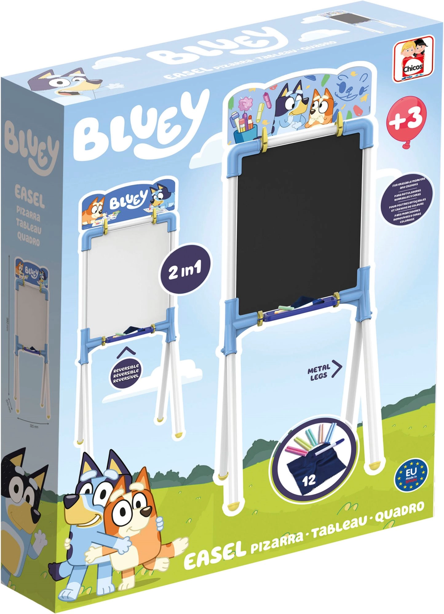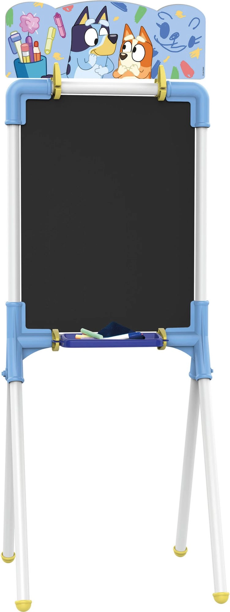 Ontdek een leuke en praktische hulp voor kleine kunstenaars – het dubbelzijdige BLUEY 2-in-1 bord. De ene zijde is wit en droog uitwisbaar voor marker, de andere zijde is klassiek zwart voor krijt. Dankzij de stabiele constructie, aflegplank en rijke accessoires is het ideaal om te tekenen, schrijven en leren.