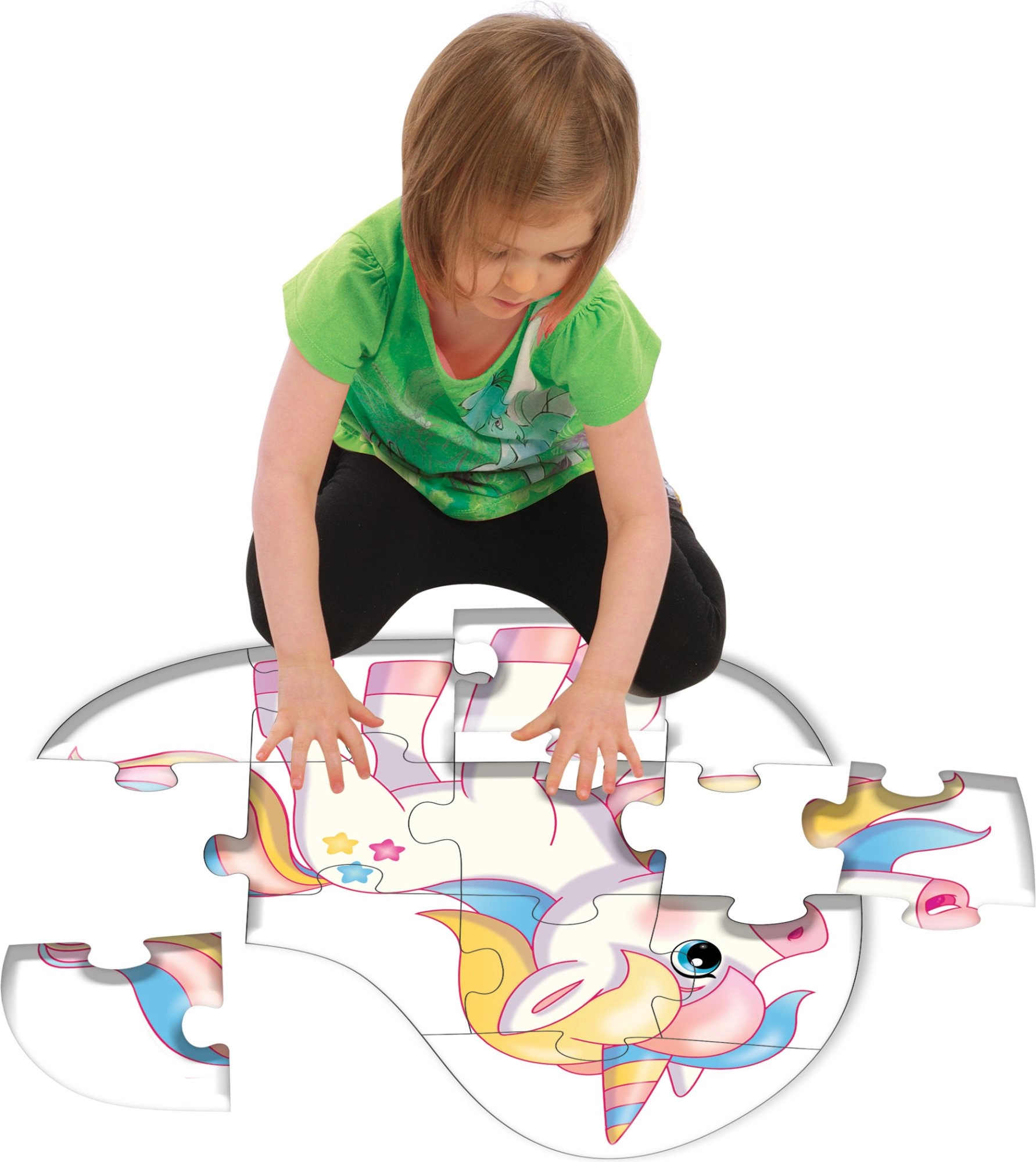 Deze silhouetpuzzel in de vorm van een eenhoorn zal alle kleine sprookjesliefhebbers betoveren. De legpuzzel meet na het leggen ongeveer 53 × 55 cm, is duidelijk zichtbaar, overzichtelijk en ideaal om op de vloer te leggen. De grotere stukken liggen ook voor kleinere kinderhanden prettig in de hand.
