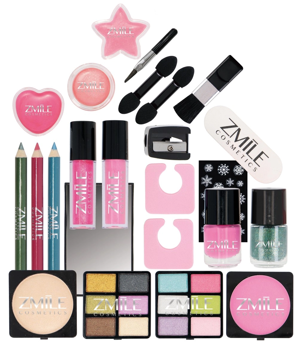 lipglossen, blush, oogschaduw, contour-/kajalpotloden voor ogen en lippen, puntenslijper, tenenseparator, nagelvijl, oogschaduwapplicators, kwastje, nagellakken, nagelstickers