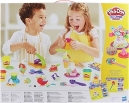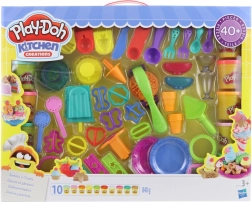 - Complete uitrusting – 10 grote potten klei en 40 accessoires (vormpjes, uitstekers, servies).