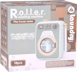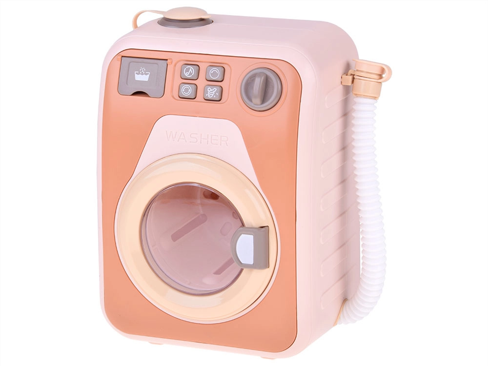 Deze interactieve wasmachine met droger 2-in-1 in aantrekkelijke pastelkleuren bootst echte apparaten natuurgetrouw na: hij heeft een bedieningspaneel, knoppen, een draaikeuzeschakelaar, een te openen trommel en reservoirs voor poeder en water. Kinderen kunnen “echt” wassen – de trommel met water vullen, een programma starten en aan het einde het water via een slang met afsluiter laten weglopen.