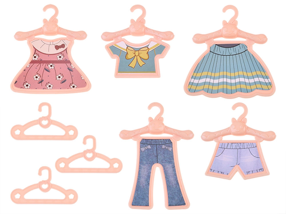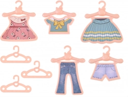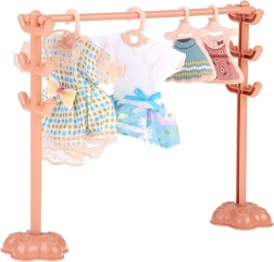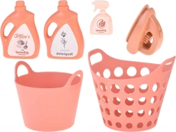 Strijkplank, strijkijzer, plantenspuit, standaard/kledingrek met hangers, 3× hanger, 2× rokhanger, 1× shortshanger, 1× broekhanger, 1× T-shirthanger, 2× wasmand, 2× flesje “wasmiddel”, 2× jurk voor poppen, stickervel
