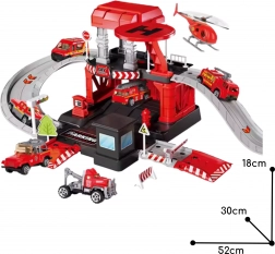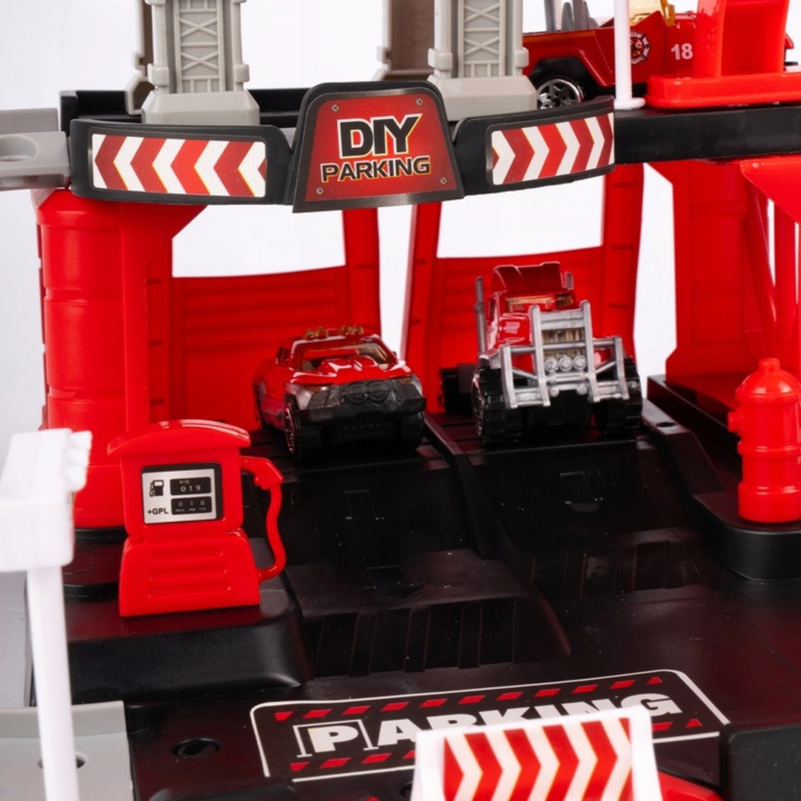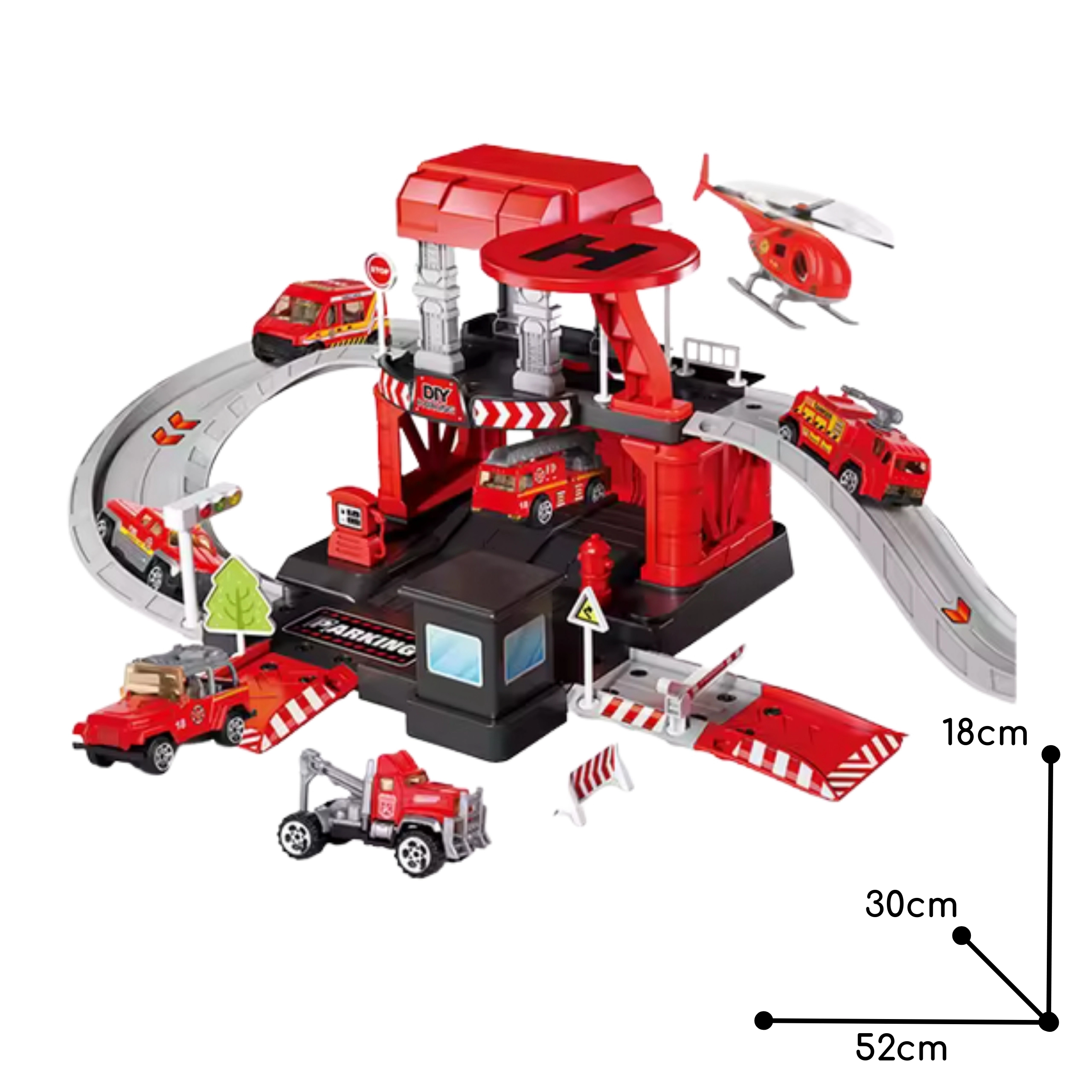Ontdek een wereld vol actie met de Woopie-set, die realistische details combineert met een duurzame constructie die veilig is voor kinderen vanaf 3 jaar. De tweelaagse parkeerplaats met afritten, lift en landingsplaats voor de helikopter biedt eindeloze speelmogelijkheden – van brandbestrijding tot het regelen van het verkeer.