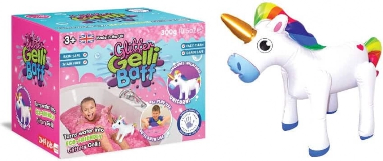 In de set zit ook een schattige opblaasbare eenhoorn die de magische sfeer compleet maakt. Het product heeft een biologisch afbreekbaar certificaat, is makkelijk afwasbaar en vlekt niet op huid of bad.