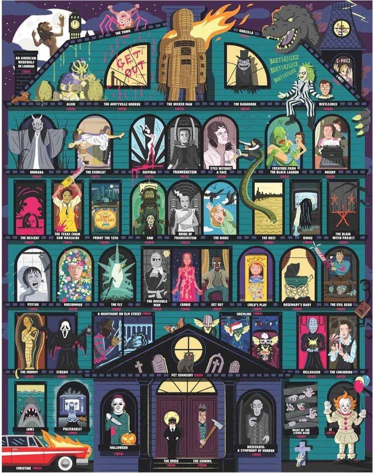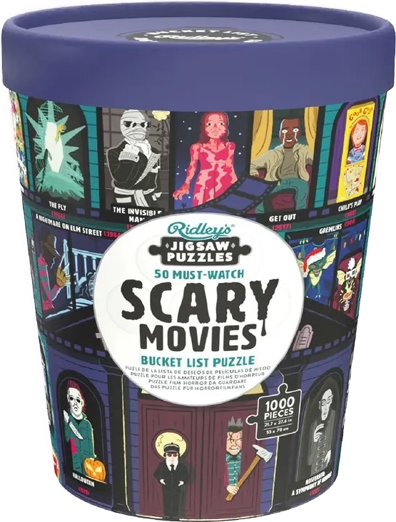 Ontdek een uitdaging voor liefhebbers van horror én puzzelen: de RIDLEY’S GAMES Bucket List-puzzel combineert plezier met filmcultuur. Duizend zorgvuldig uitgesneden stukjes vormen een motief met 50 griezelfilms die elke fan gezien moet hebben. Dankzij de meegeleverde voorbeeldposter is het leggen overzichtelijk en leuk, ook in een groep.