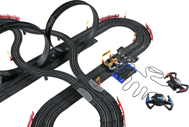 Modulaire onderdelen met veiligheidsafzettingen zorgen voor stabiliteit, zelfs in de snelste passages. De twee controllers kunnen op de basis worden aangesloten of op batterijen werken, zodat je vrij kunt racen volgens je eigen regels. Dankzij de lange baan is er ruimte voor inhalen, tactisch rijden en dramatische finishes.