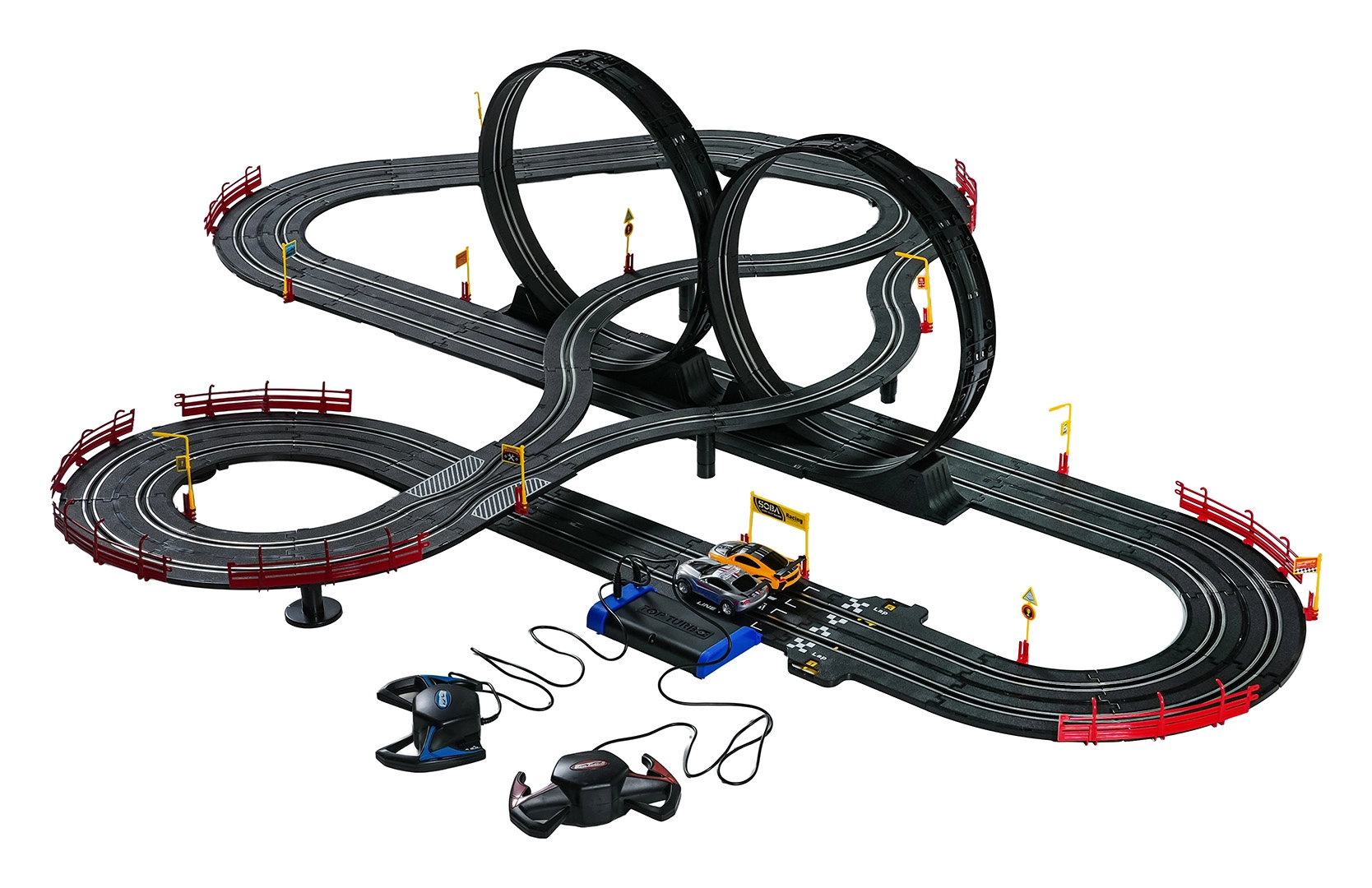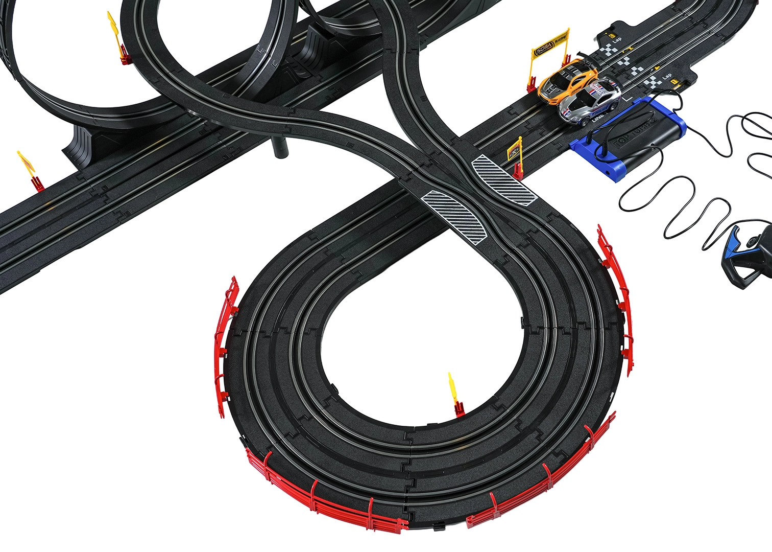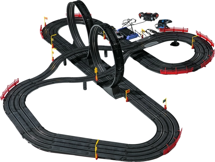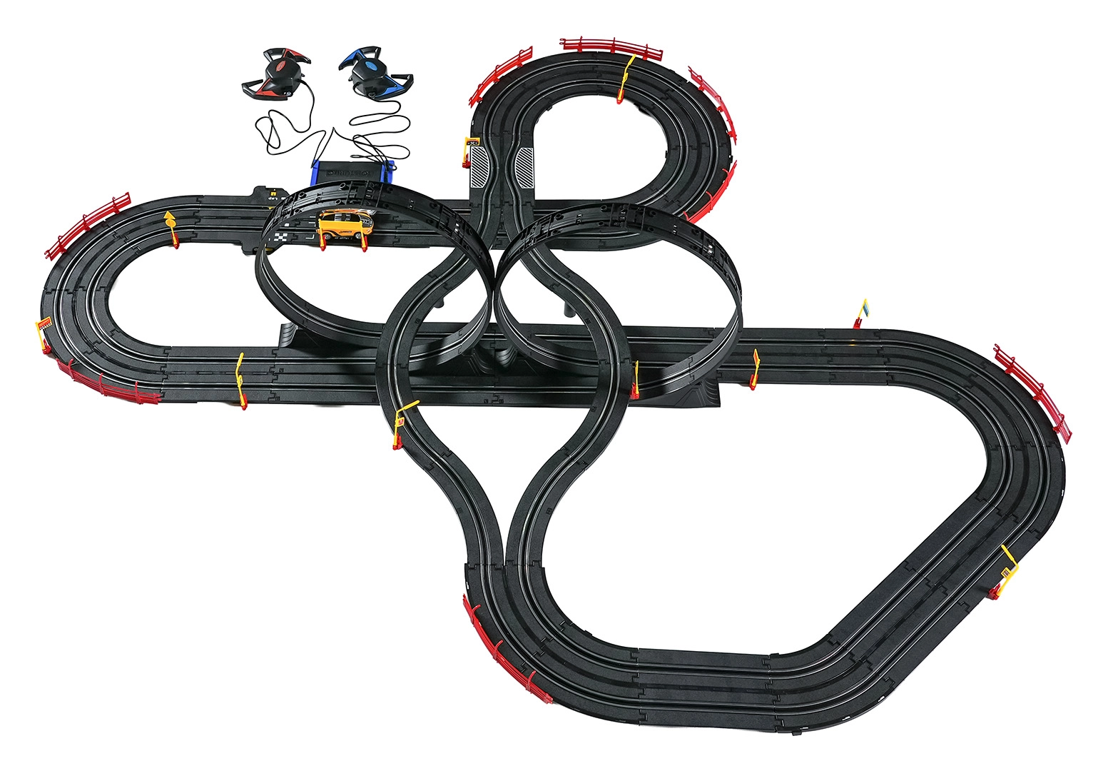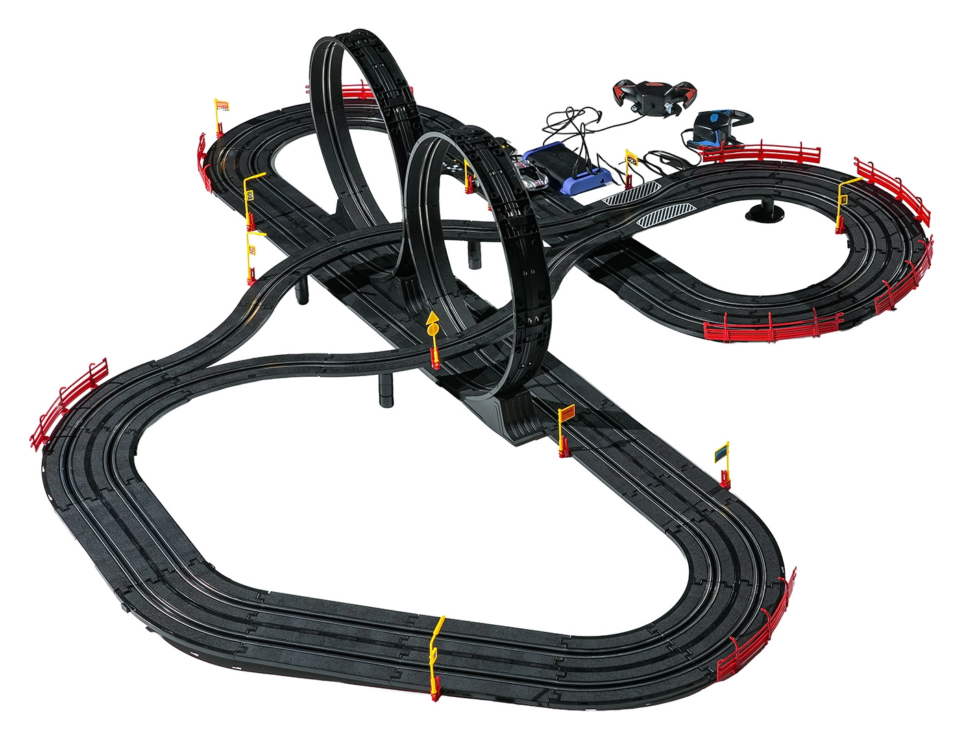 Gigantische elektrische racebaan voor twee spelers met een lengte tot 790 cm, met dubbele loopings, scherpe bochten en lange rechte stukken voor spannende duels. In de verpakking zitten 2 raceauto’s met lichteffecten en 2 controllers in de vorm van een stuur. De baan kan worden gevoed via de 12 V-adapter (inbegrepen) of met batterijen, zodat je altijd en overal kunt racen.